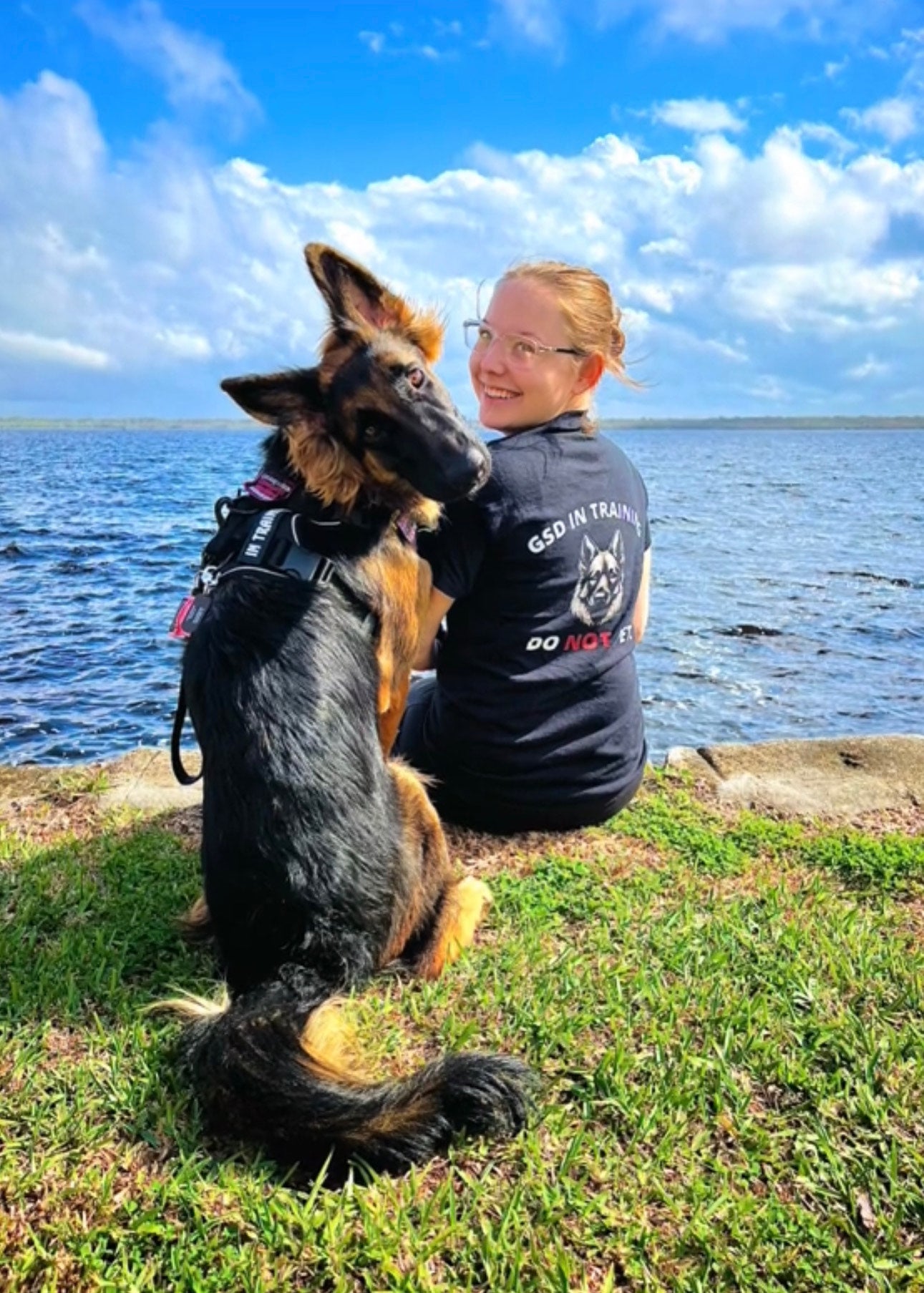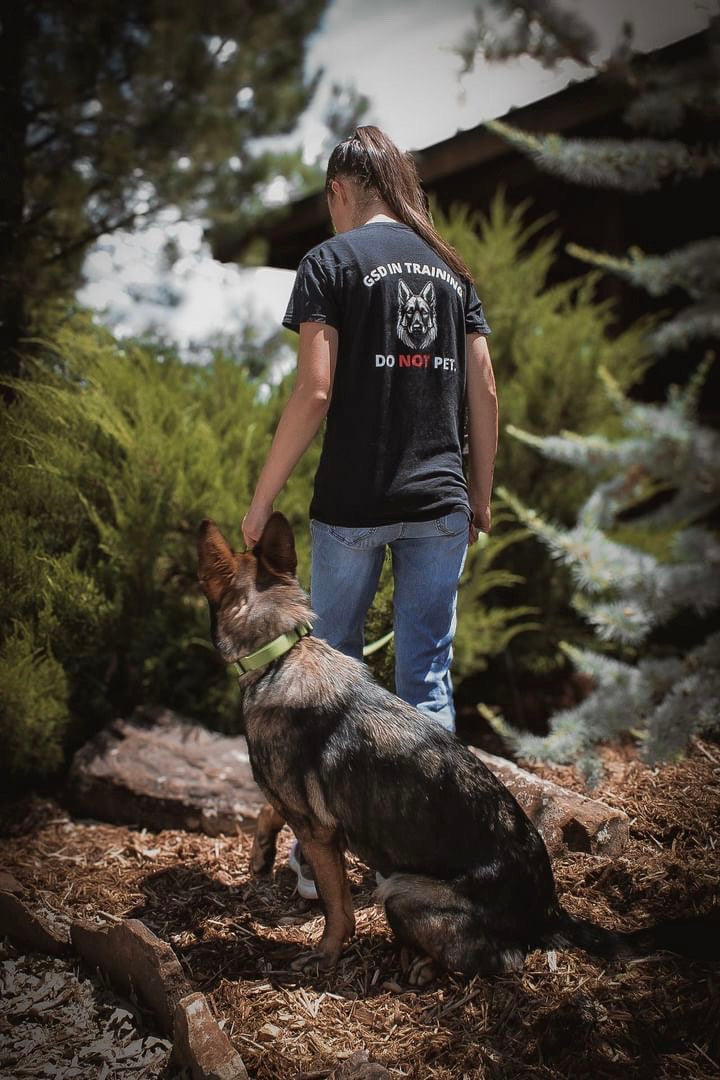 Isabella is wearing our best-selling 'GSD In Training' T-shirt alongside her fierce shepherd, Renegade. Check them out on Instagram: @renegadethesablegsd