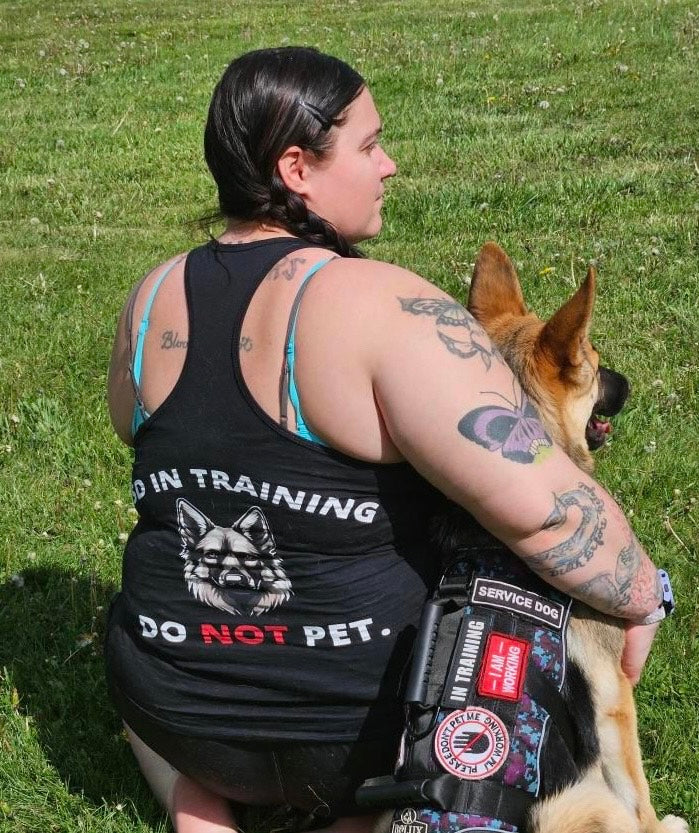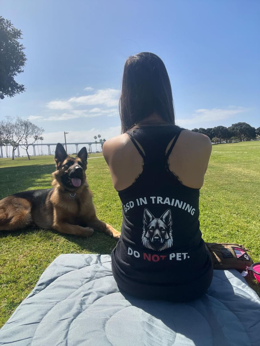 Jennifer rocking our GSD IN TRAINING tank top with her loyal pup, Athena, by her side. Check them out! Instagram: @athenas.gsd.adventures