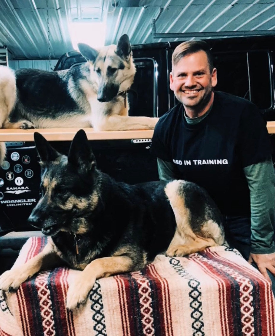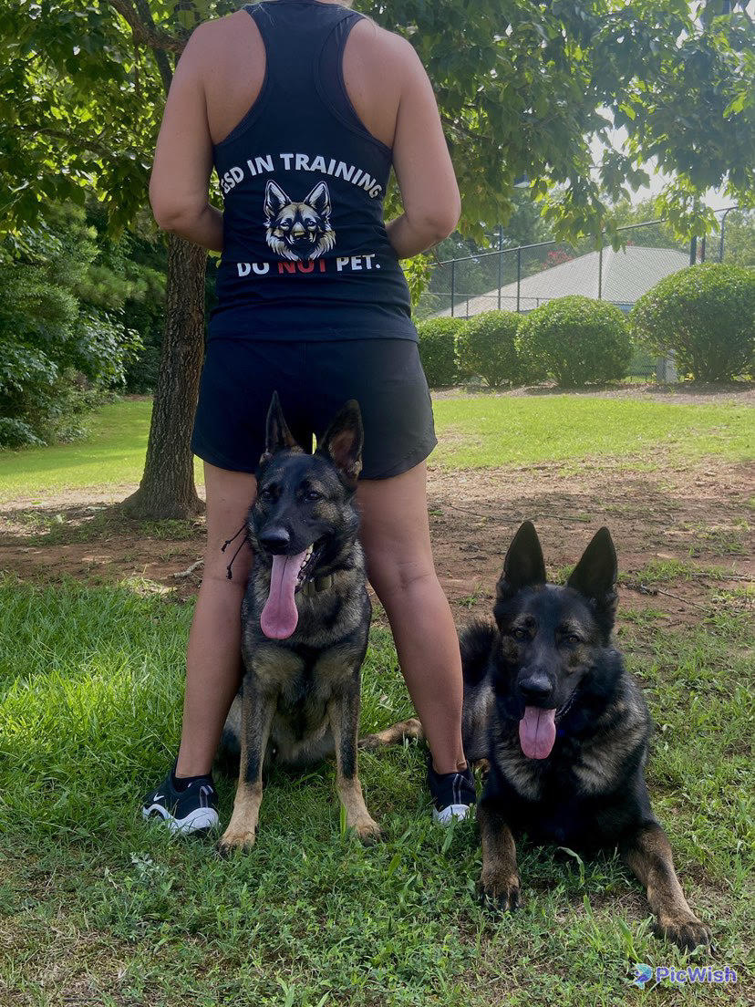 Beth is wearing our GSD IN TRAINING Tank top alongside her gorgeous Shepherds, Zena and Xena. Follow Zen on Instagram: @zenthedarksablegsd