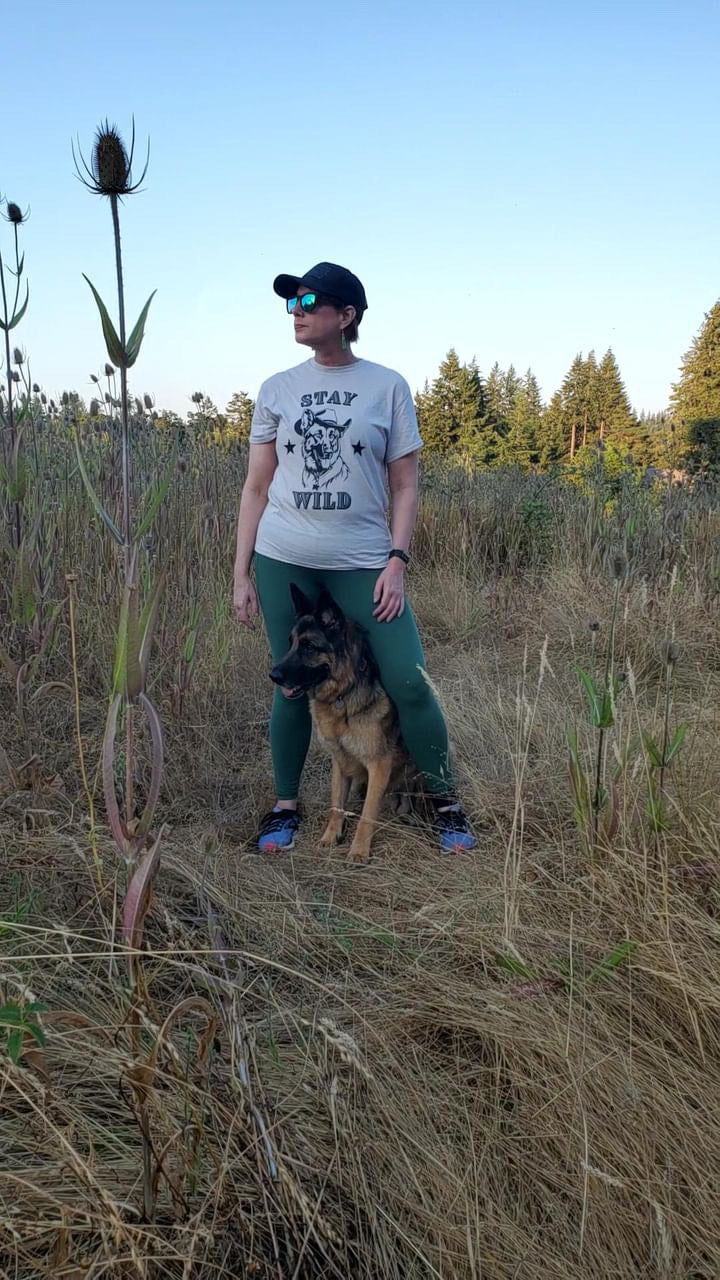 Katherine is wearing our 'Wild Life' T-shirt with her beautiful shepherd, Holiday. Follow them on TikTok: @dame_holiday