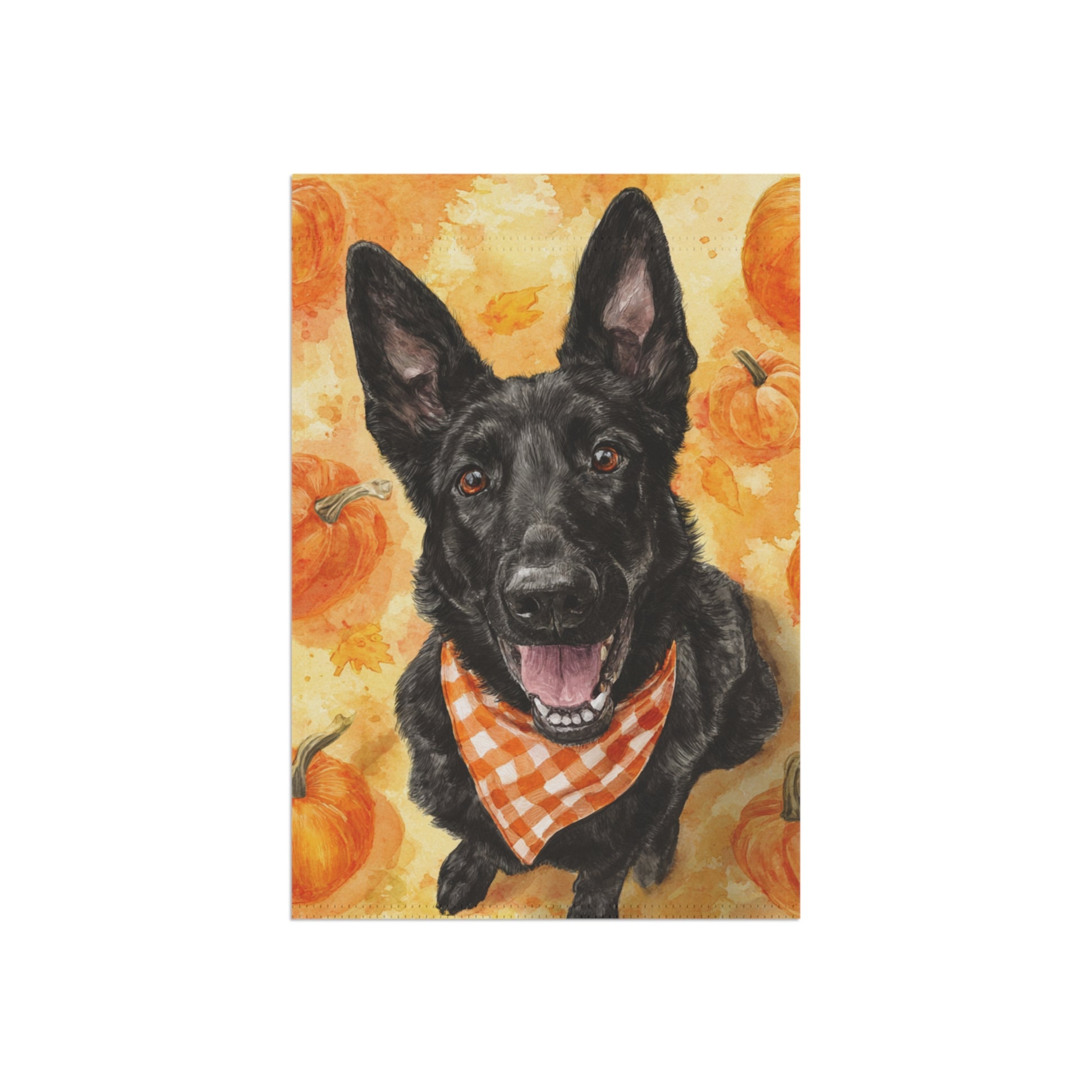 Bring the warmth of fall to your home or garden with our Black German Shepherd Fall Banner. This stunning design features a majestic black shepherd wearing an orange and white plaid bandana, gazing upward with devotion and curiosity. Surrounding the pup are vibrant orange pumpkins and soft hints of fall foliage, all set against a gentle watercolor backdrop that captures the beauty of the season.