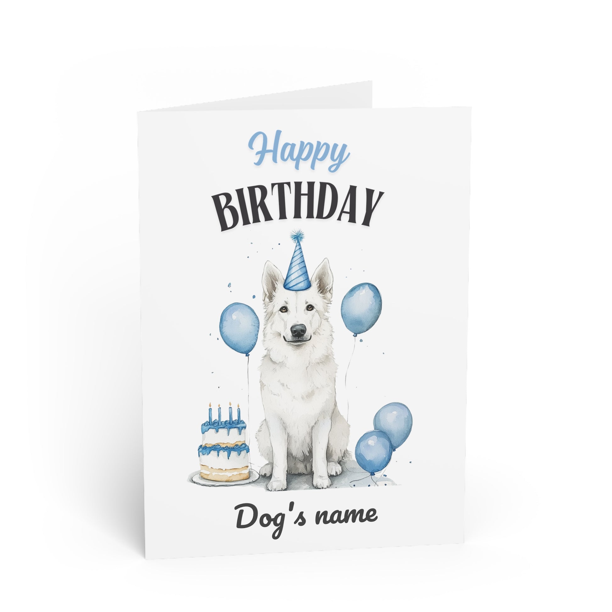 Make their birthday paws-itively unforgettable with our Custom Name Birthday Card! Featuring an adorable white German Shepherd and a blue theme, this card bursts with festive vibes. Personalized with 'Happy Birthday [Name]' front and center, it’s the perfect blend of fun and charm.