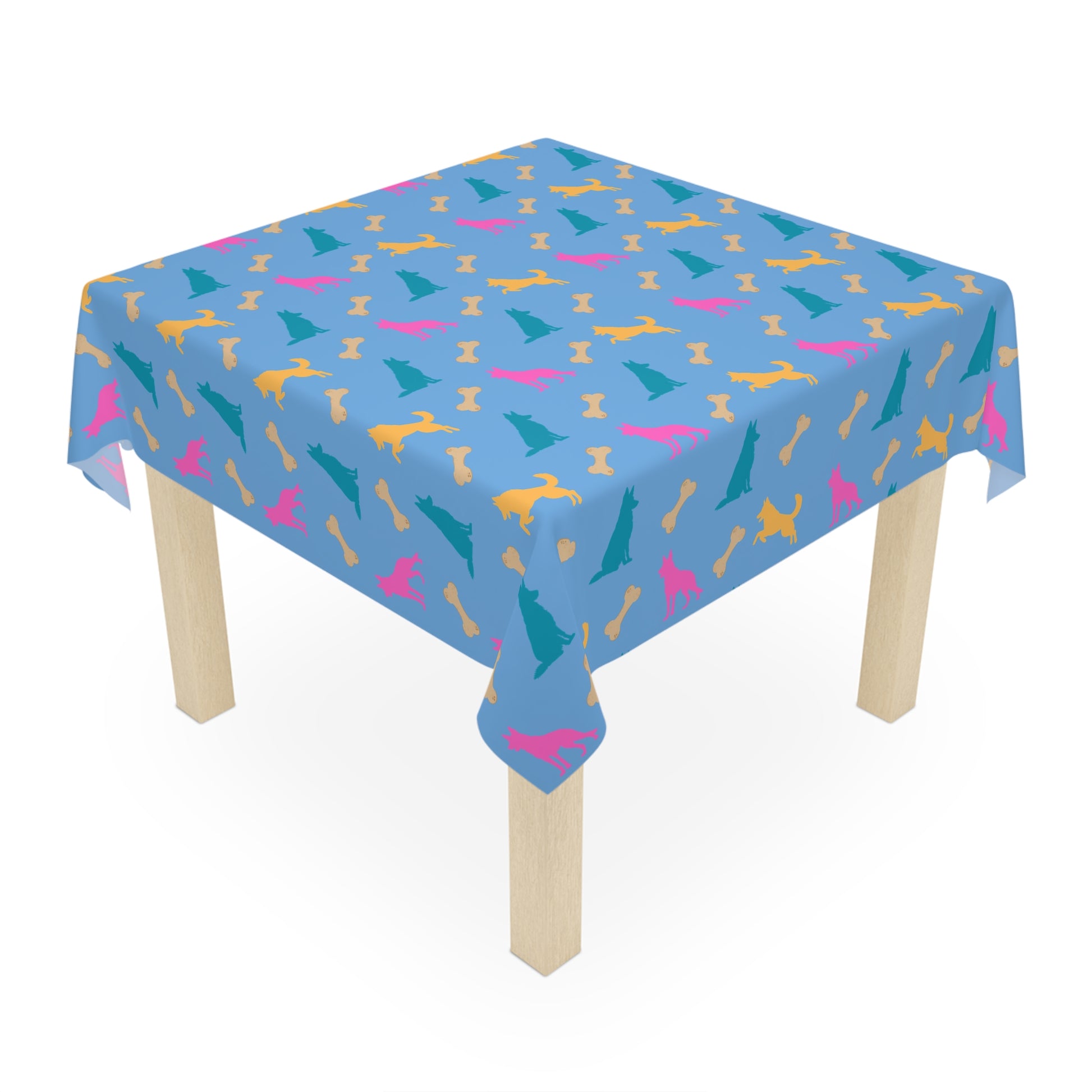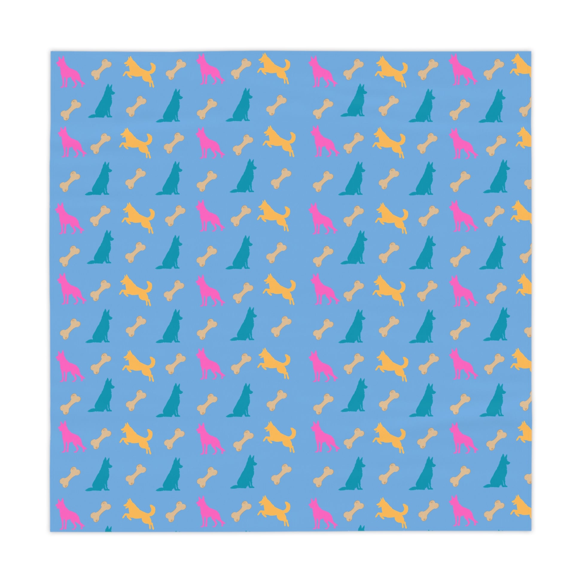 Create a festive and vibrant atmosphere with this delightful birthday tablecloth featuring a charming pattern of colorful German Shepherds and playful dog treats.