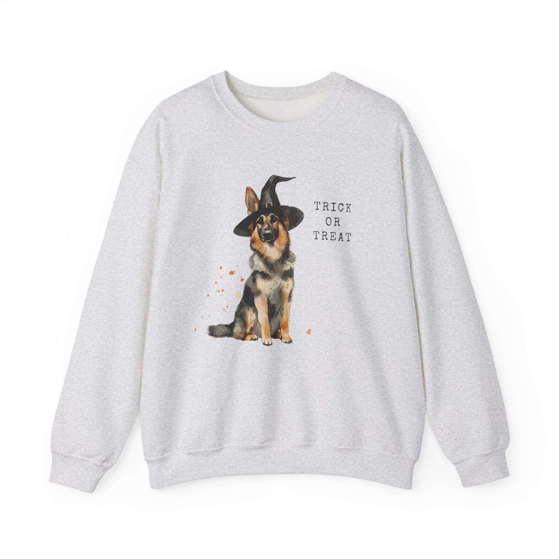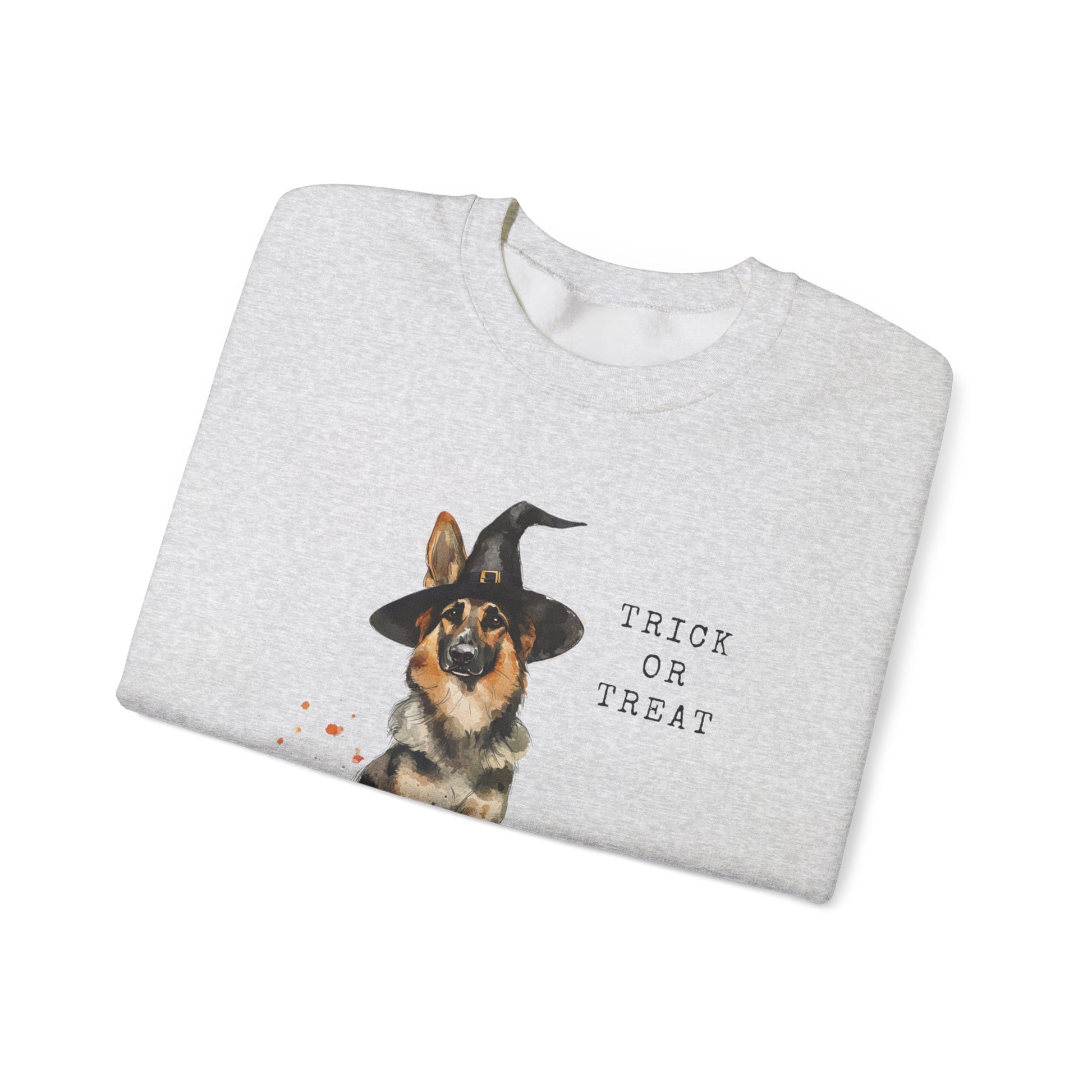 Show off your love for German Shepherds and Halloween with this beautiful, minimalistic T-shirt featuring a watercolor design of a German Shepherd dog wearing a witch hat. The subtle yet charming artwork is paired with the playful words "Trick or Treat," making this shirt a perfect blend of elegance and festive fun. Ideal for Halloween celebrations or casual wear, this T-shirt is a must-have for dog lovers who appreciate unique, artistic designs.