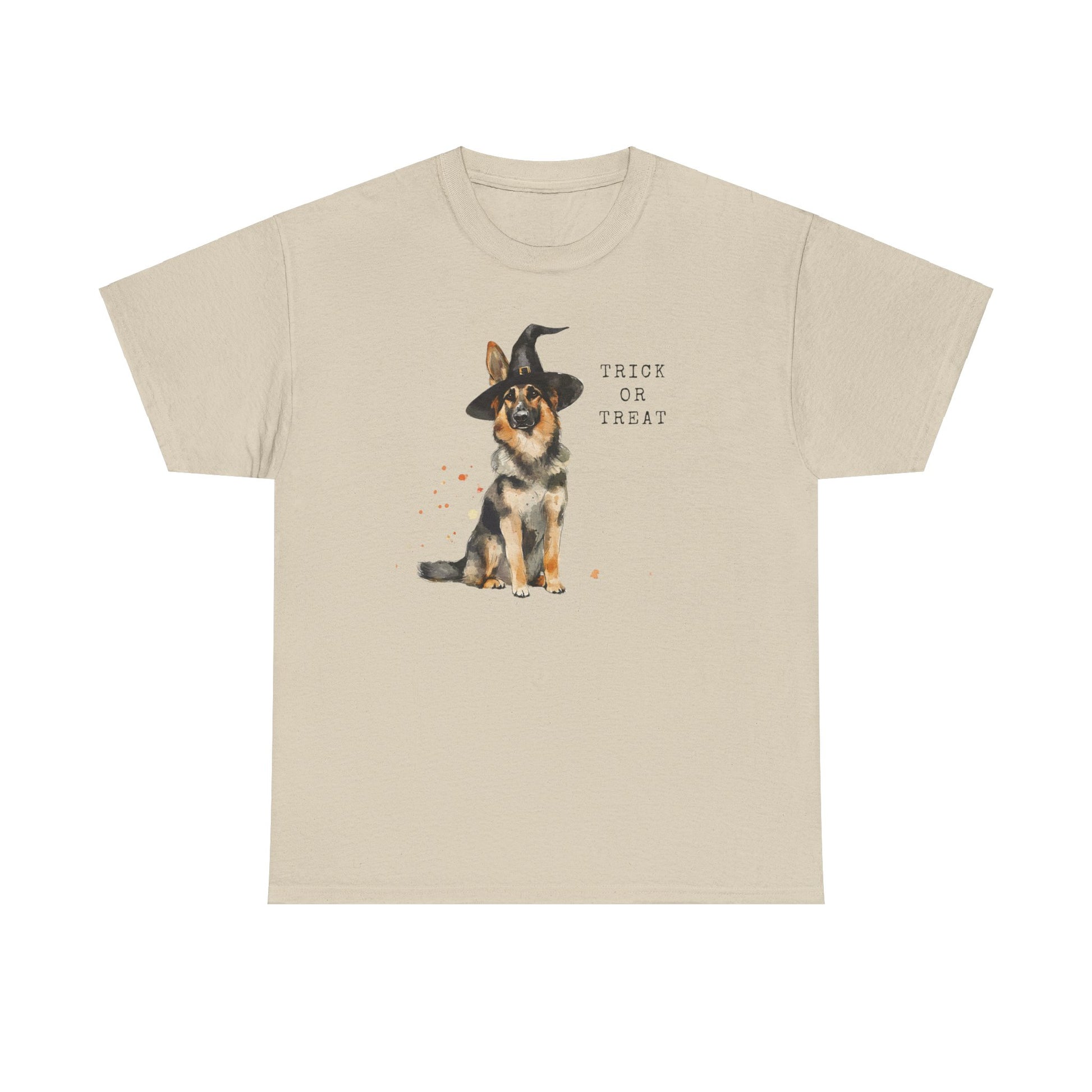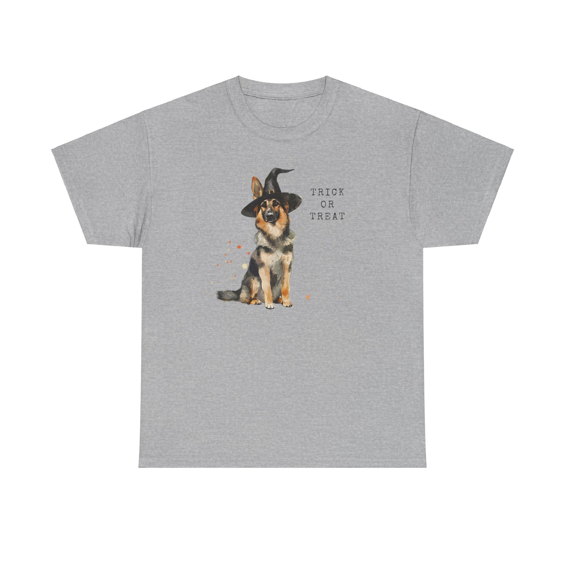 Show off your love for German Shepherds and Halloween with this beautiful, minimalistic T-shirt featuring a watercolor design of a German Shepherd dog wearing a witch hat. The subtle yet charming artwork is paired with the playful words "Trick or Treat," making this shirt a perfect blend of elegance and festive fun. Ideal for Halloween celebrations or casual wear, this T-shirt is a must-have for dog lovers who appreciate unique, artistic designs.