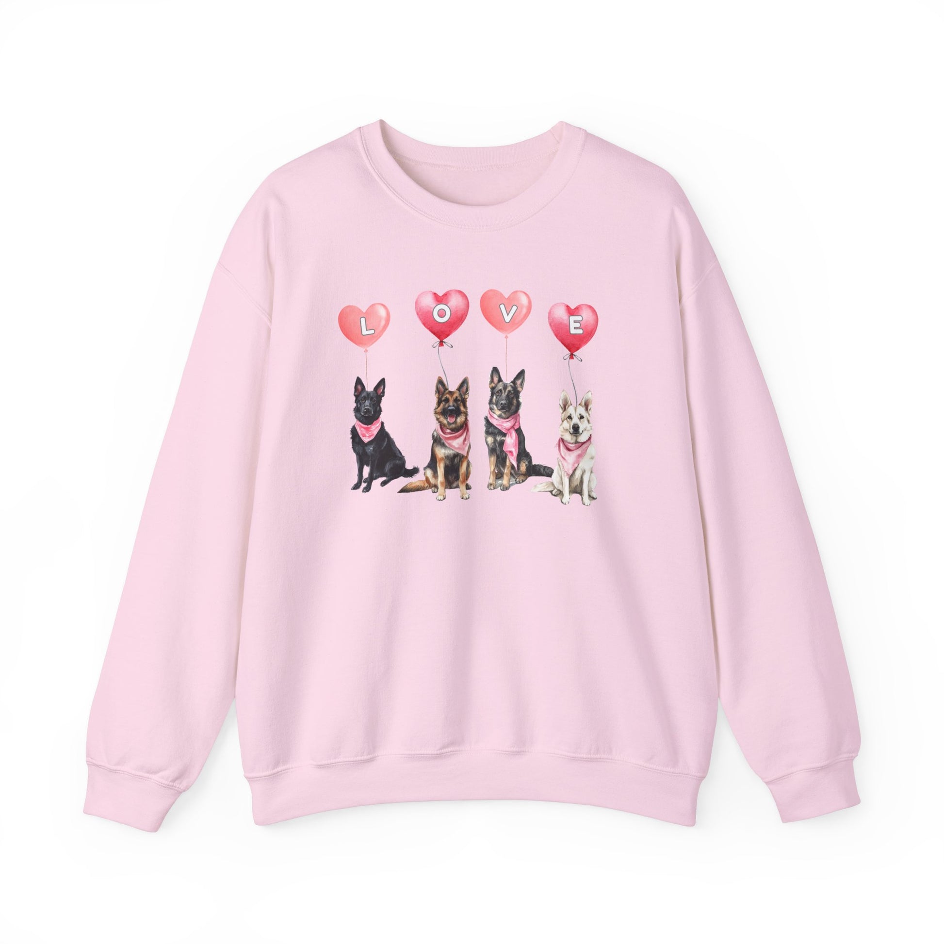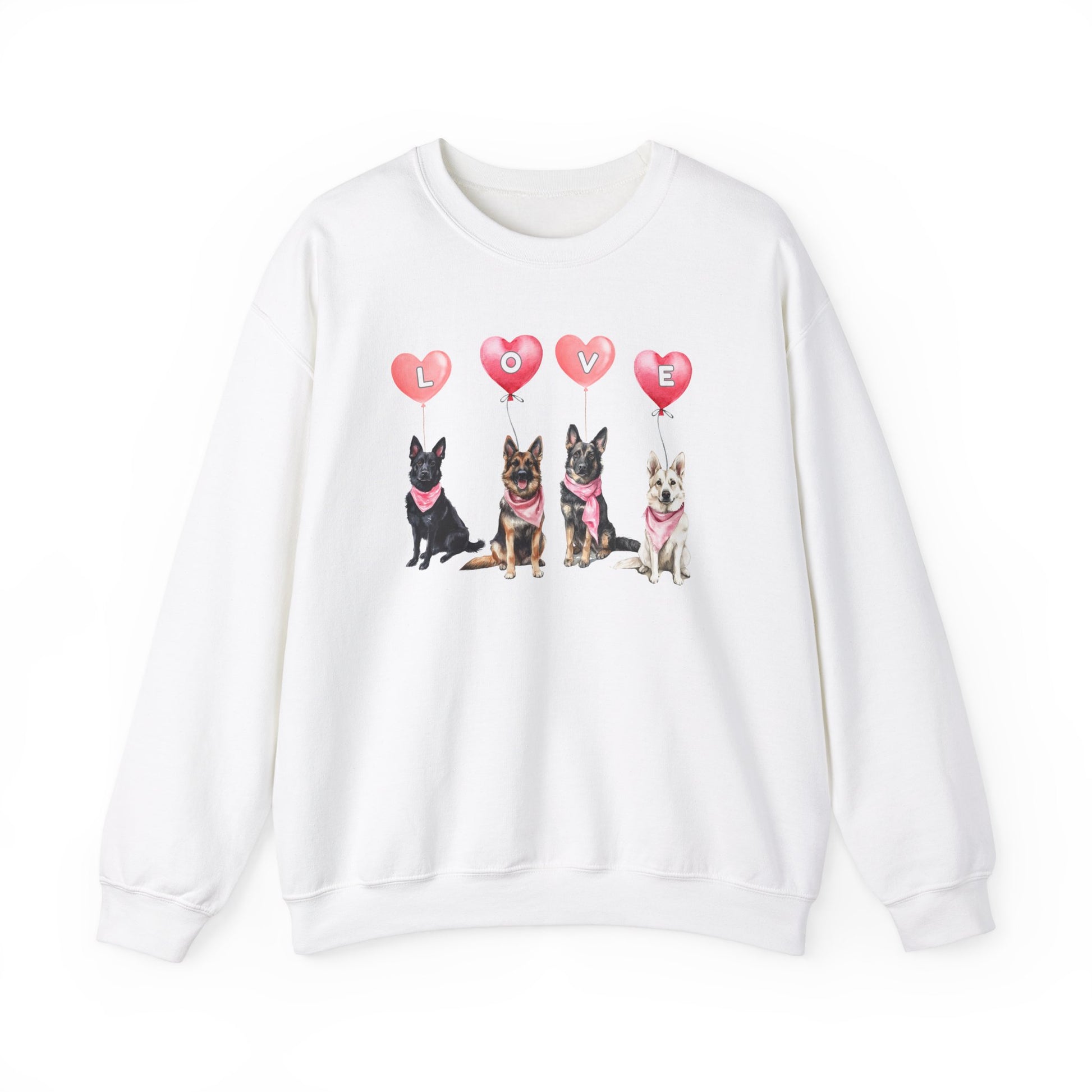 Celebrate love in style with our Valentine's Shepherds Sweater! This adorable design features four playful German Shepherds, each holding heart-shaped balloons, surrounded by the word "LOVE" in bold, festive lettering.