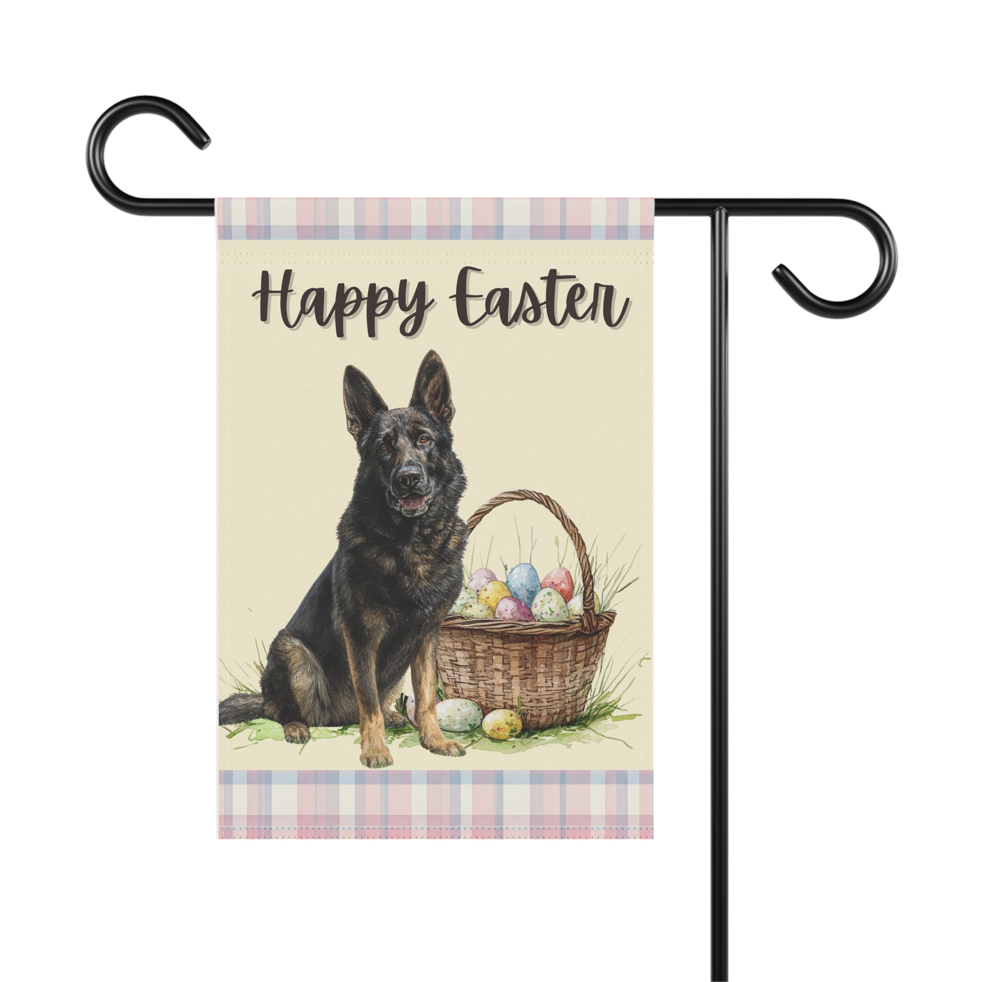Celebrate Easter in style with our adorable German Shepherd Easter banner! Featuring a charming German Shepherd ready for Easter fun, this festive design showcases the pup sitting proudly beside a basket overflowing with colorful eggs. The background is a soft pastel yellow, complemented by a pink, white, and purple plaid touch, creating a bright and cheerful Easter aesthetic. The words "Happy Easter" stand out on the front, making it the perfect décor piece for your home, garden, or front porch.