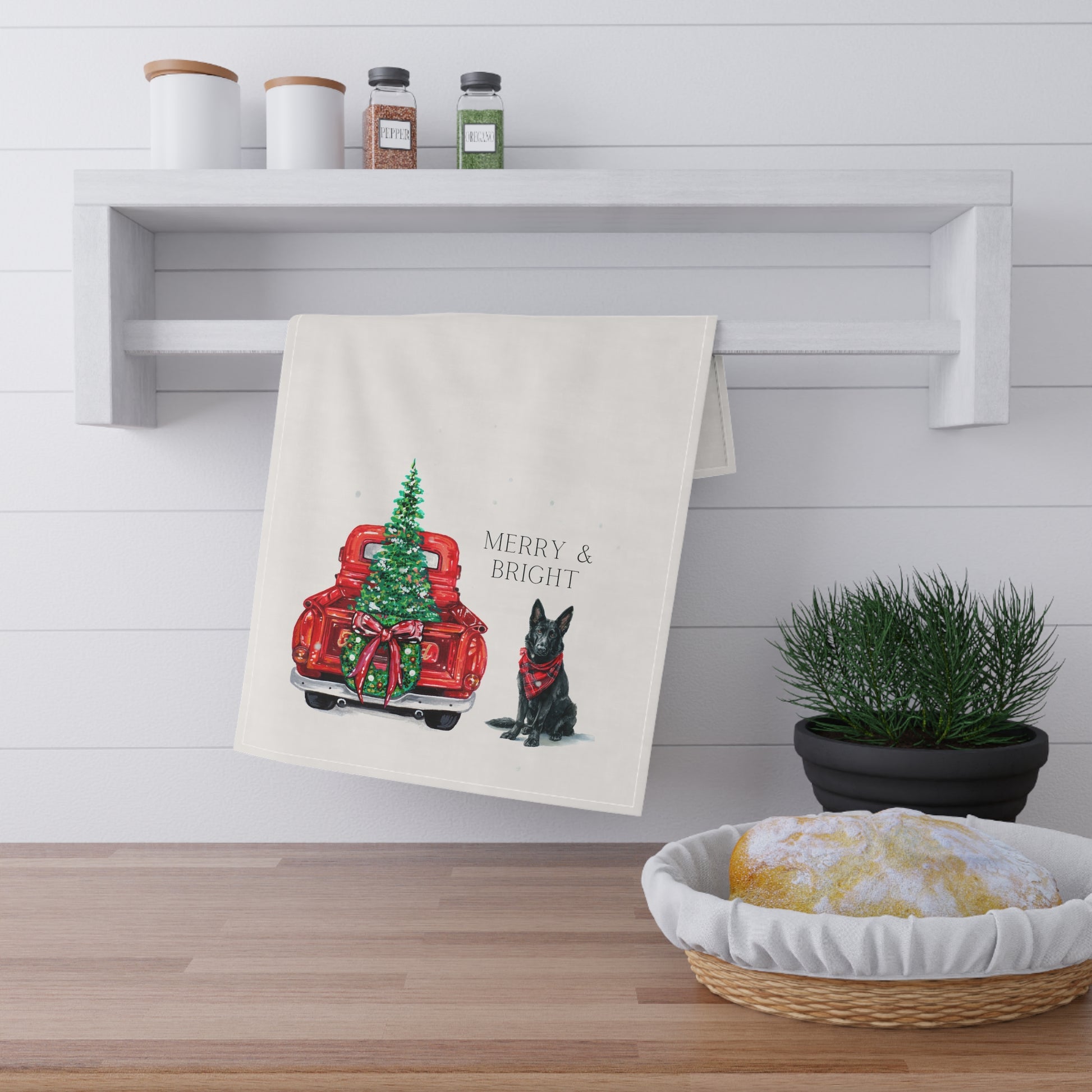 This beautiful towel features a watercolor Christmas scene with a classic red truck carrying a tree in the back, a festive wreath on the tailgate, and a German Shepherd sitting proudly beside it in a red plaid bandana.