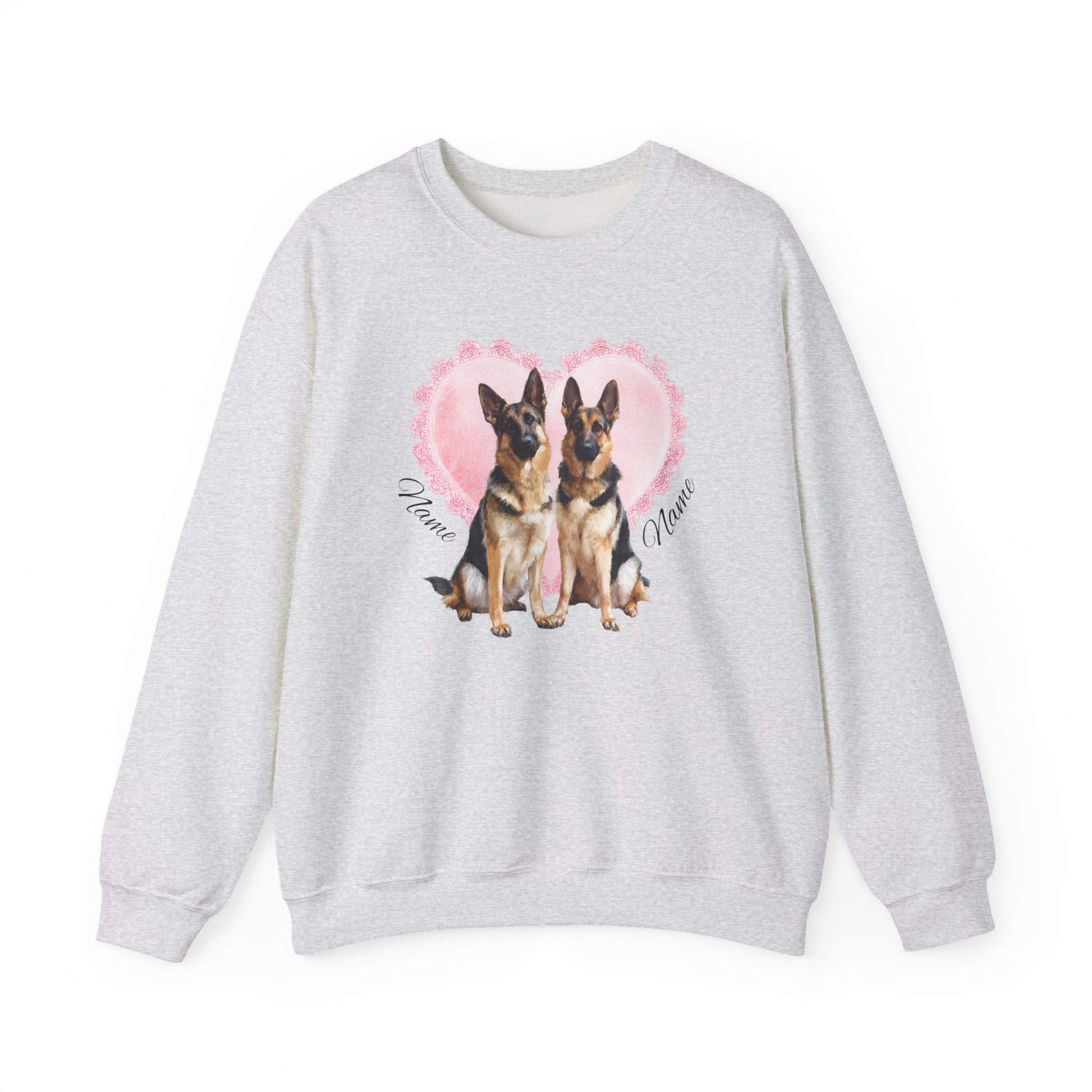 This cozy sweatshirt features a beautiful German Shepherds with a delicate lace heart design behind them, creating a soft yet meaningful Valentine-inspired look. Personalized with your Shepherd’s name, this piece becomes a one-of-a-kind tribute to the bond you share..