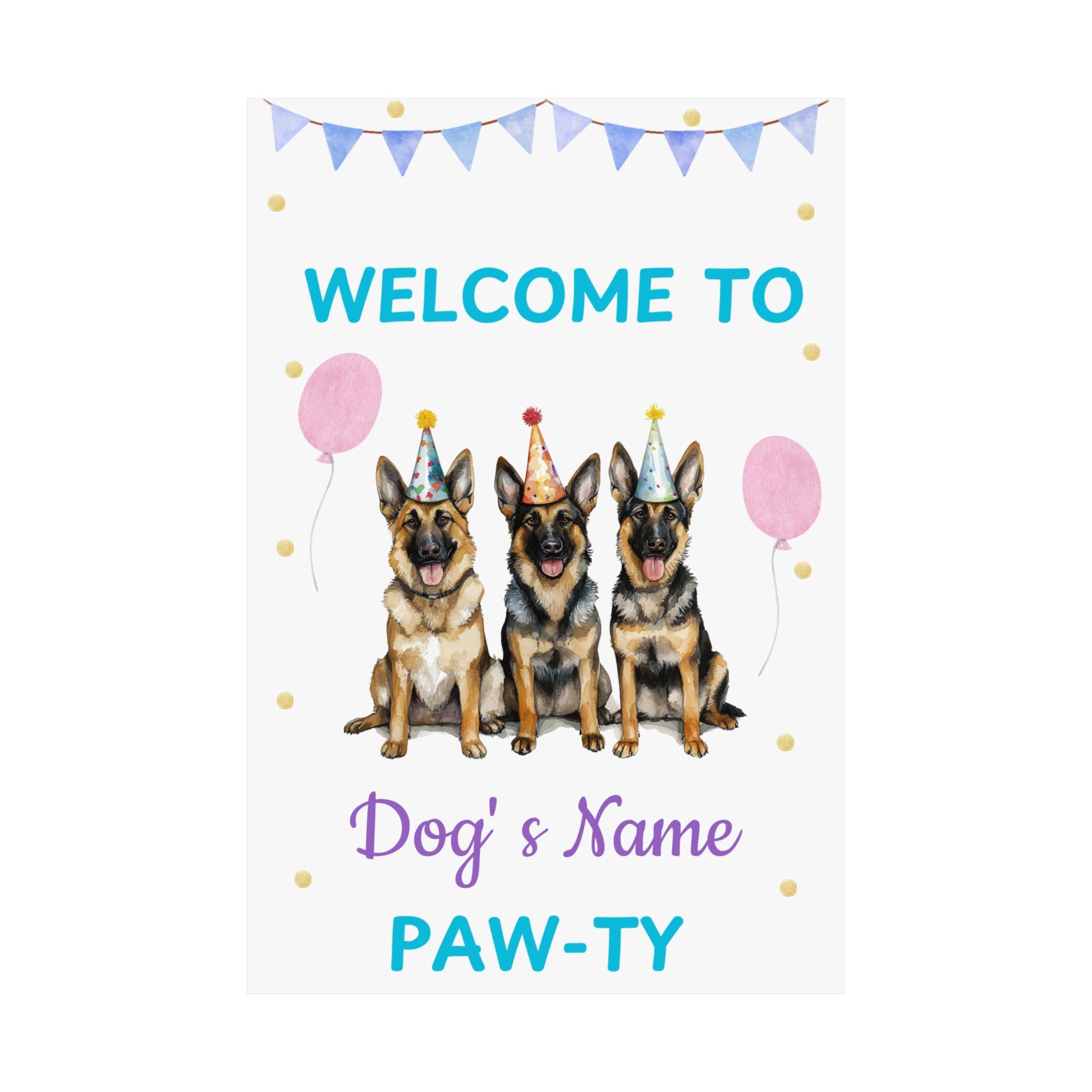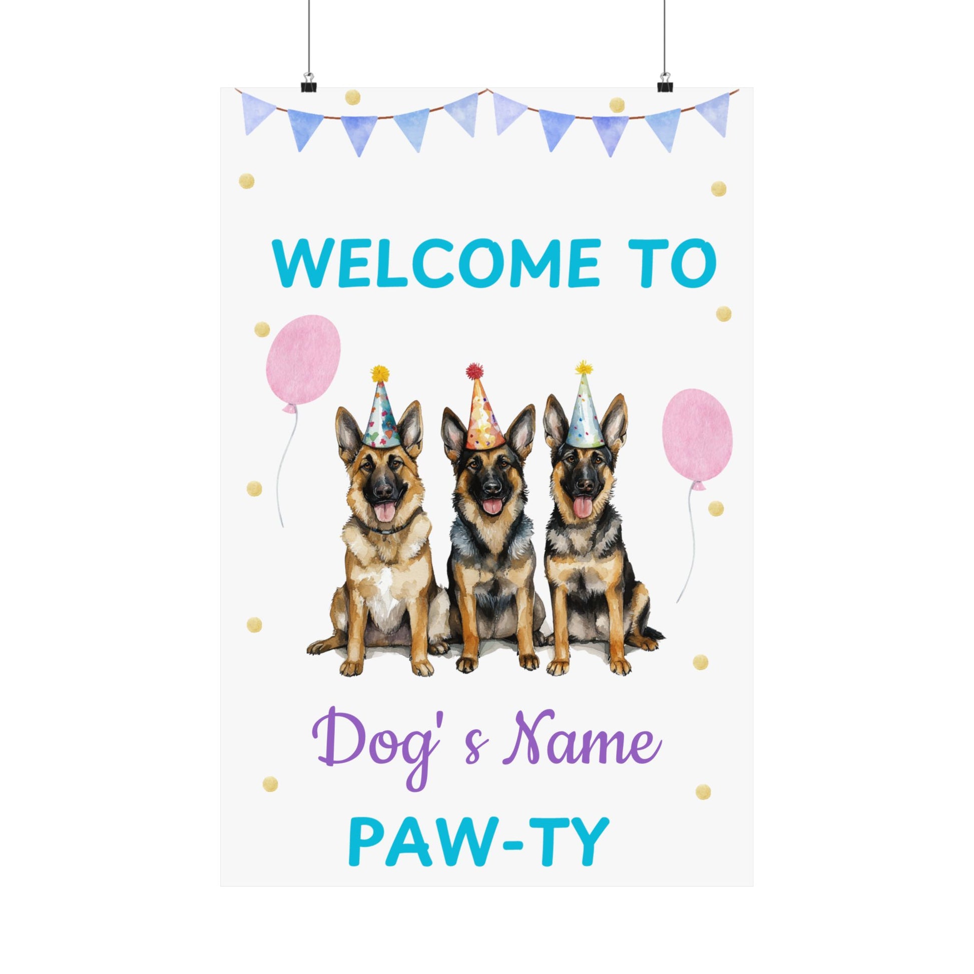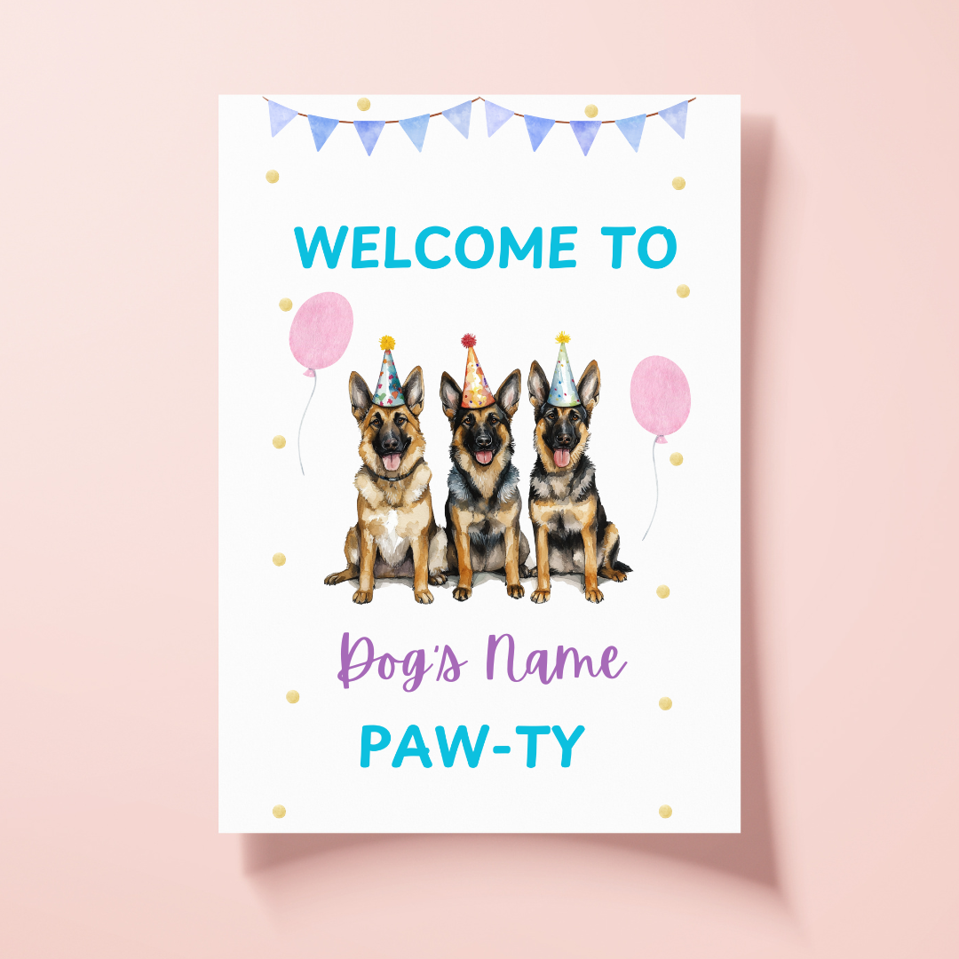 Welcome guests to your German Shepherd’s special day with our charming "Welcome to [Name]'s Paw-ty" poster! This beautifully designed poster features three adorable watercolor German Shepherds, each dressed in festive birthday attire, surrounded by playful paw prints and colorful decorations. Customize it with your dog’s name to create a warm, personal greeting that sets the perfect tone for the celebration. Whether hung at the entrance or used as a photo backdrop, this poster adds a whimsical and artistic touch to your pup's birthday party, making it an unforgettable event!