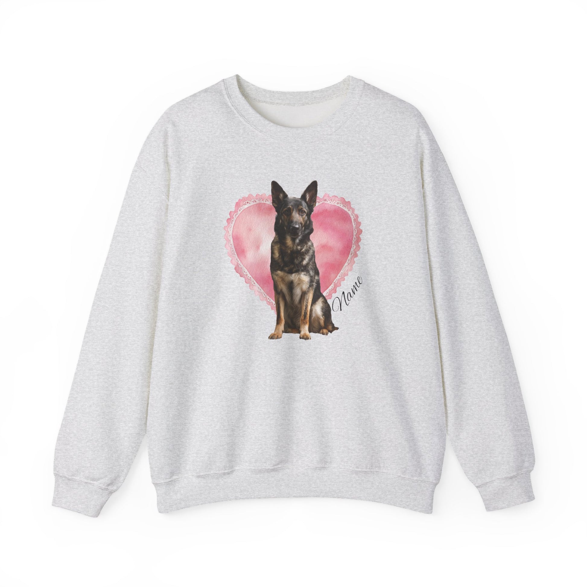 This cozy sweatshirt features a beautiful German Shepherd with a delicate lace heart design behind them, creating a soft yet meaningful Valentine-inspired look. Personalized with your Shepherd’s name, this piece becomes a one-of-a-kind tribute to the bond you share..
