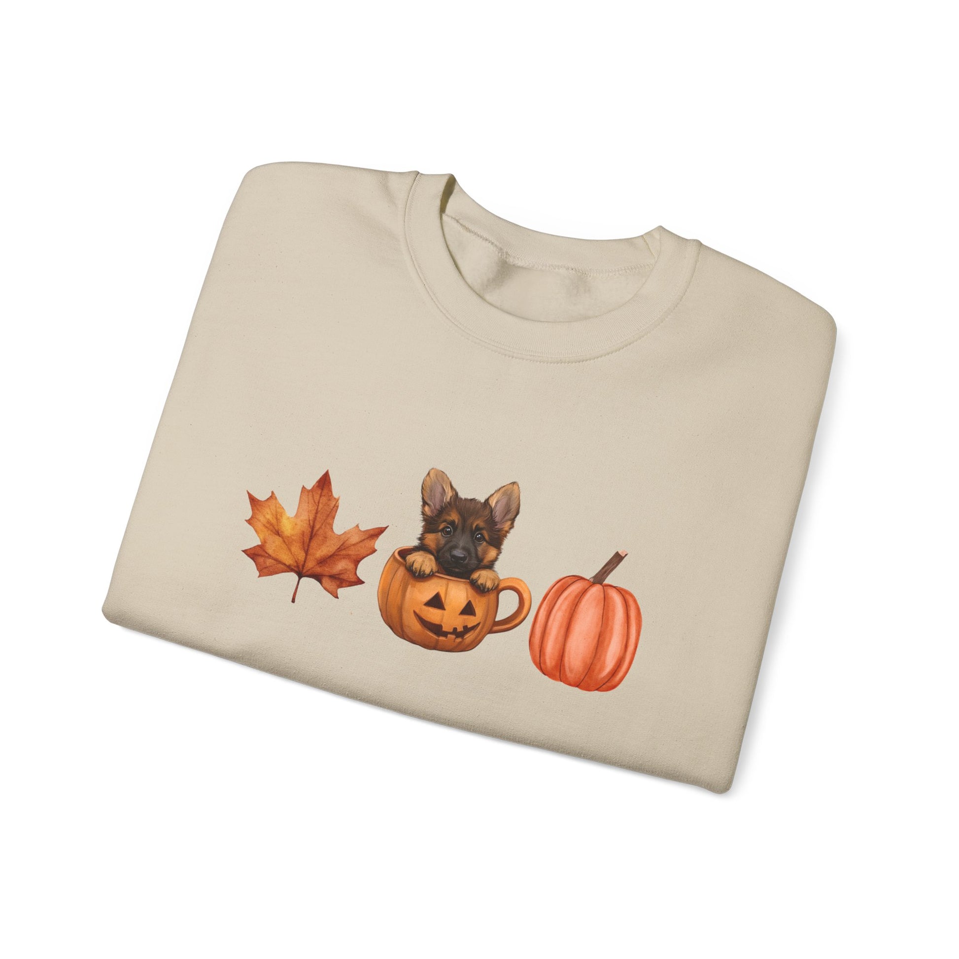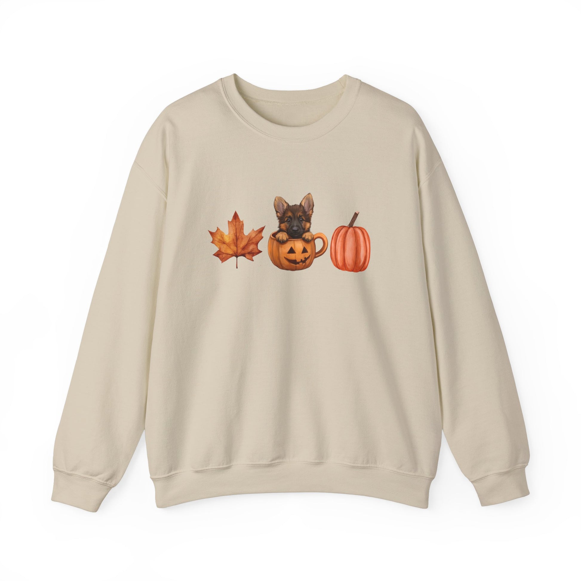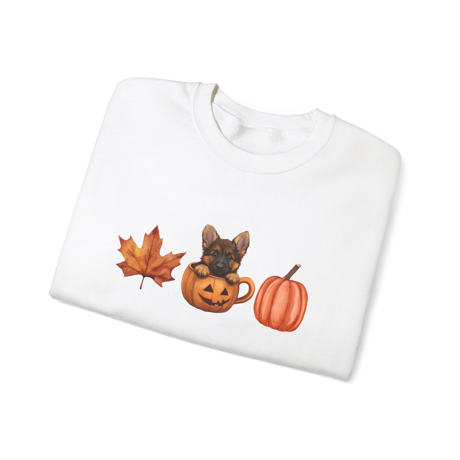 Cozy up this fall with a charming sweatshirt featuring a cute German Shepherd puppy nestled inside a pumpkin mug. The simple and aesthetic design is accented with a delightful fall pattern of a Leaf and pumpkin, making it a perfect choice for the season. This unique and adorable sweatshirt is ideal for dog lovers who want to embrace the autumn vibes in style.