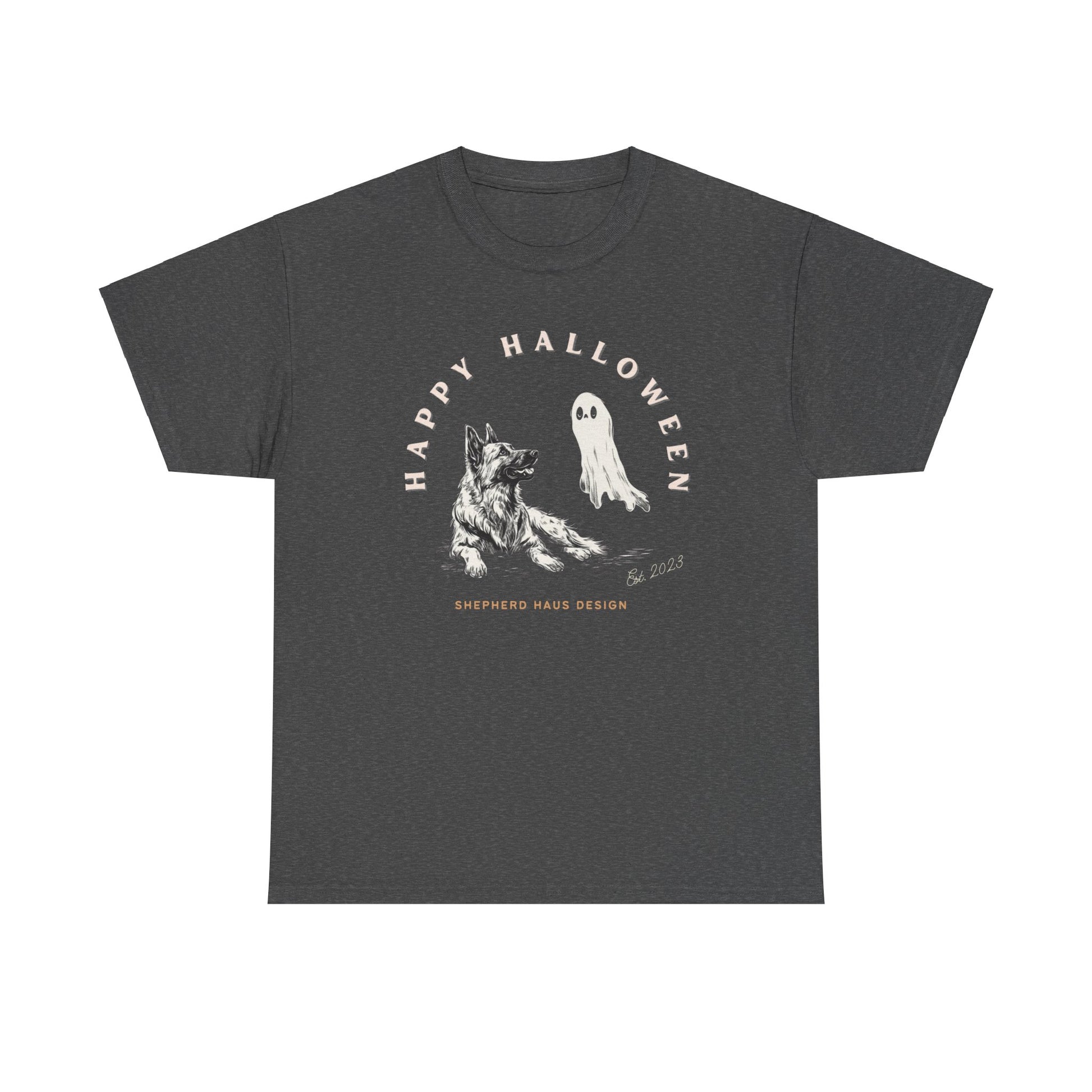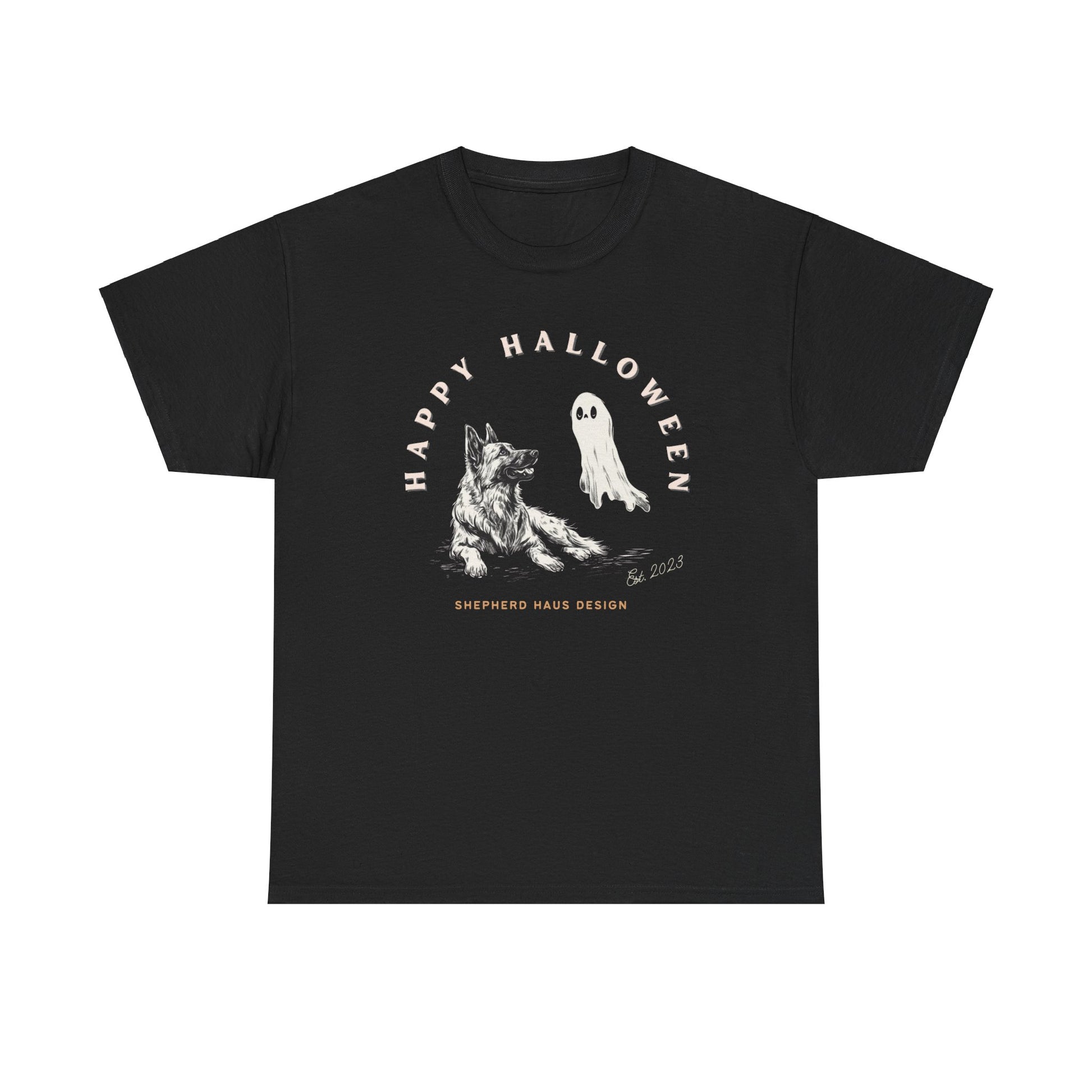 Celebrate Halloween in style with Shepherd Haus Designs Halloween Edition T-shirt, featuring a playful German Shepherd alongside a spooky ghost. This unique design blends the loyal charm of a German Shepherd with classic Halloween elements, making it a standout piece for the season. Perfect for dog lovers who enjoy festive and fun apparel, this shirt is a must-have for Halloween.
