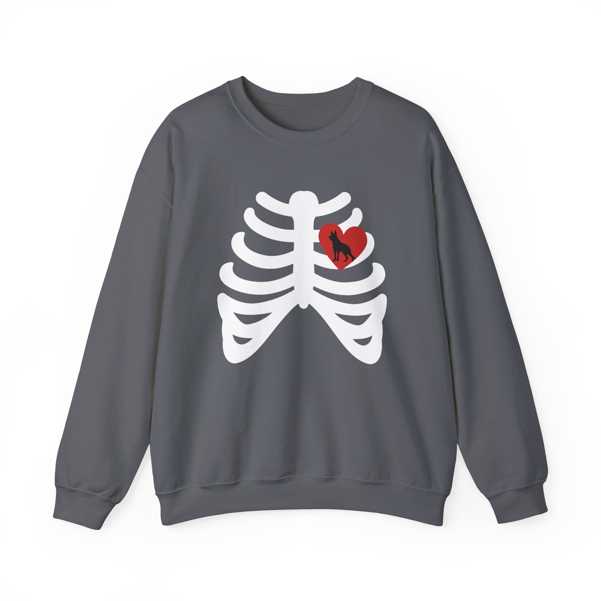 Show off your Halloween spirit with a twist of German Shepherd pride! Our Skeleton Ribcage German Shepherd sweater features a bold rib design with a bright heart—and inside that heart, a striking silhouette of a German Shepherd. Perfect for dog lovers who like their spooky style with a touch of loyalty and love, this shirt is both festive and unique.