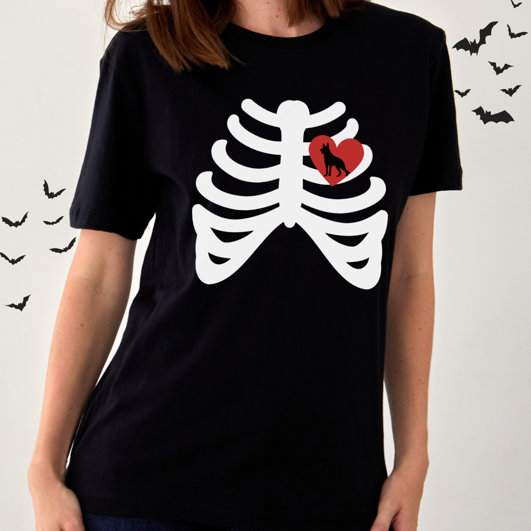 Show off your Halloween spirit with a twist of German Shepherd pride! Our Skeleton Ribcage German Shepherd Tee features a bold rib design with a bright heart—and inside that heart, a striking silhouette of a German Shepherd. Perfect for dog lovers who like their spooky style with a touch of loyalty and love, this shirt is both festive and unique.