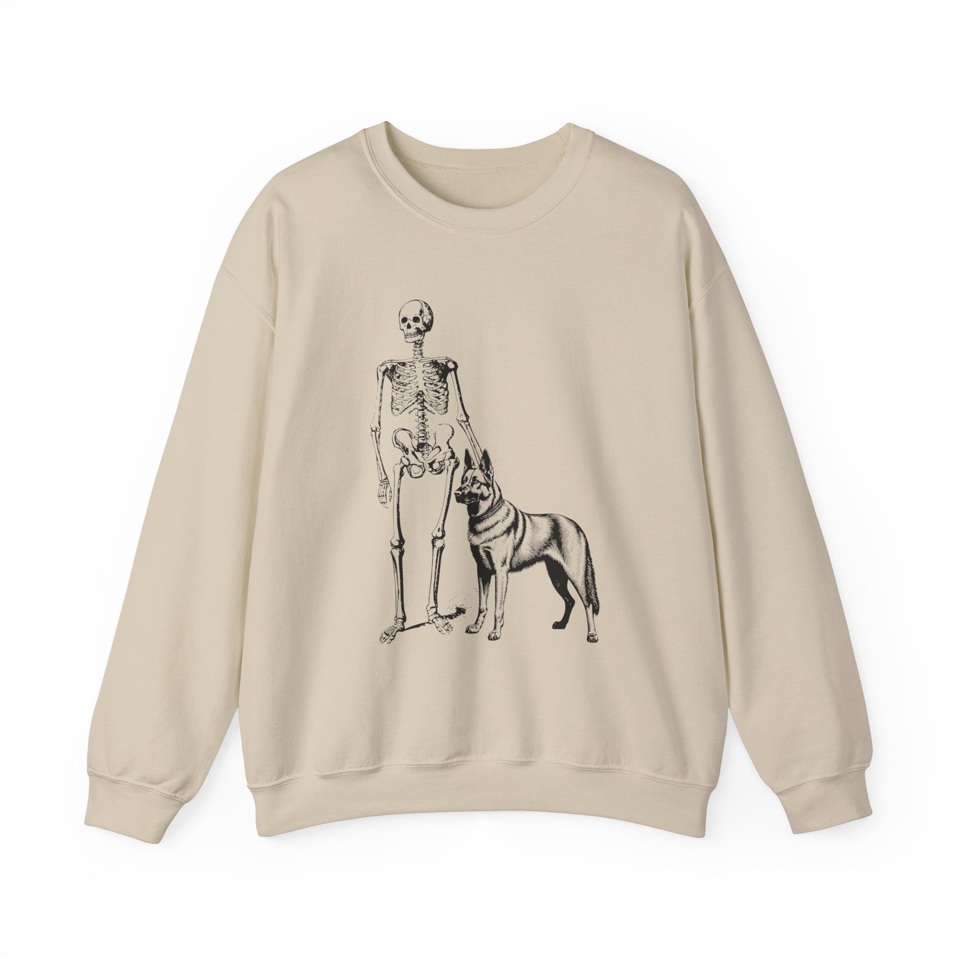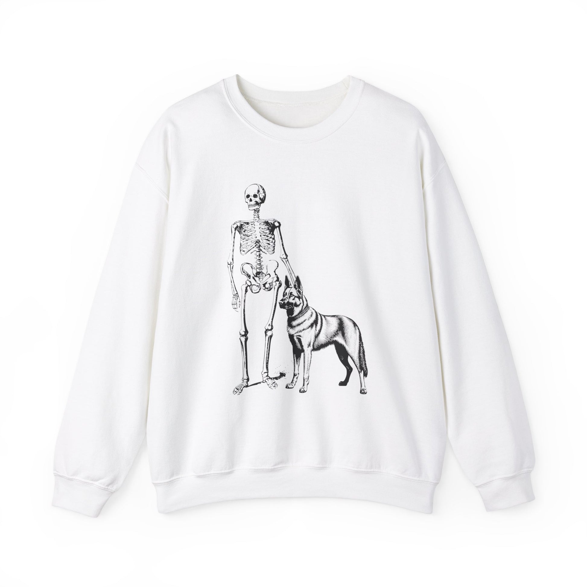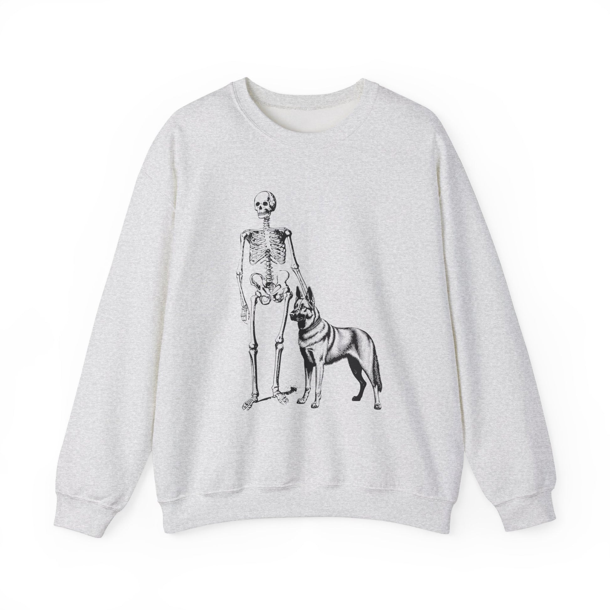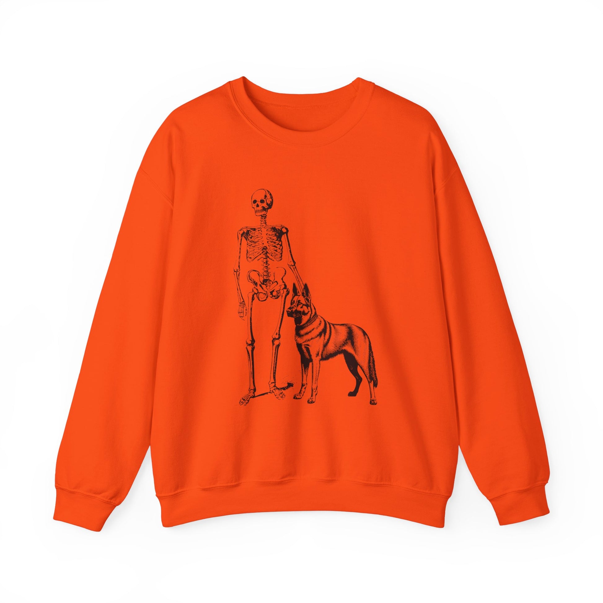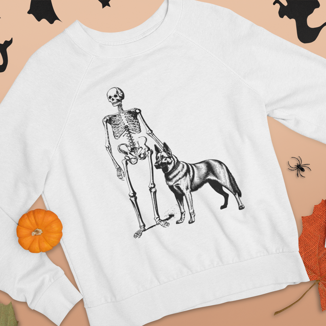 Get into the Halloween spirit with this cool Sweatshirt featuring a skeleton alongside his loyal German Shepherd pal. This simple yet unique design perfectly blends spooky vibes with a touch of canine loyalty, making it an ideal choice for Halloween festivities. Whether you're headed to a party or just enjoying the season, this sweatshirt offers a fun and stylish way to celebrate.