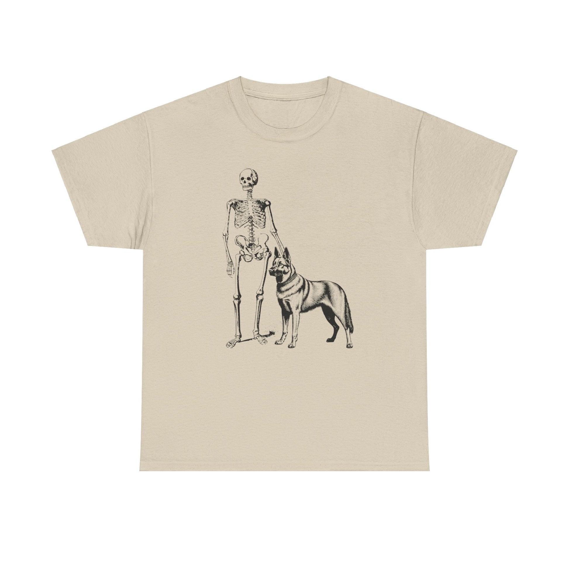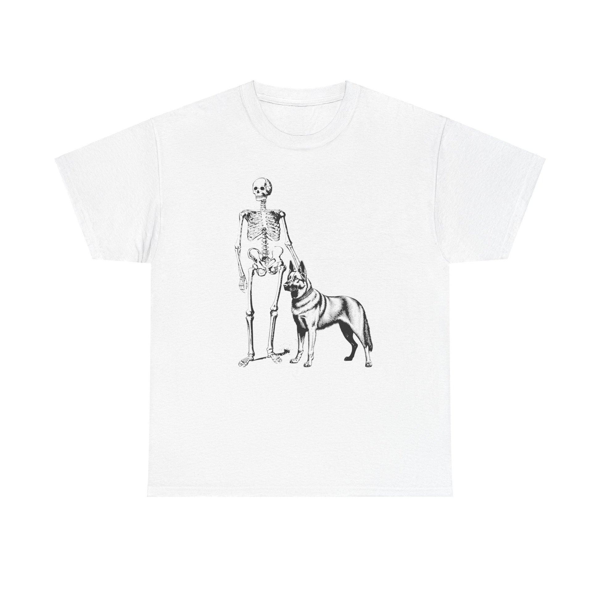Get into the Halloween spirit with this cool T-shirt featuring a skeleton alongside his loyal German Shepherd pal. This simple yet unique design perfectly blends spooky vibes with a touch of canine loyalty, making it an ideal choice for Halloween festivities. Whether you're headed to a party or just enjoying the season, this shirt offers a fun and stylish way to celebrate.