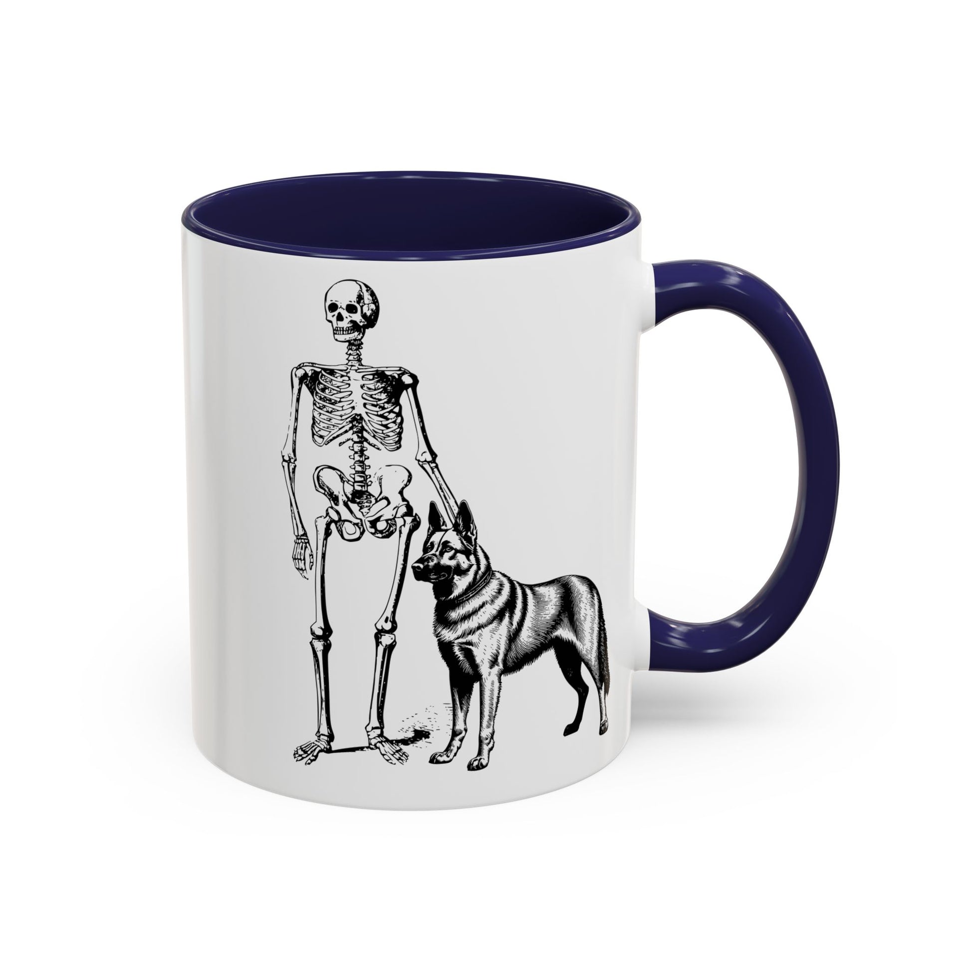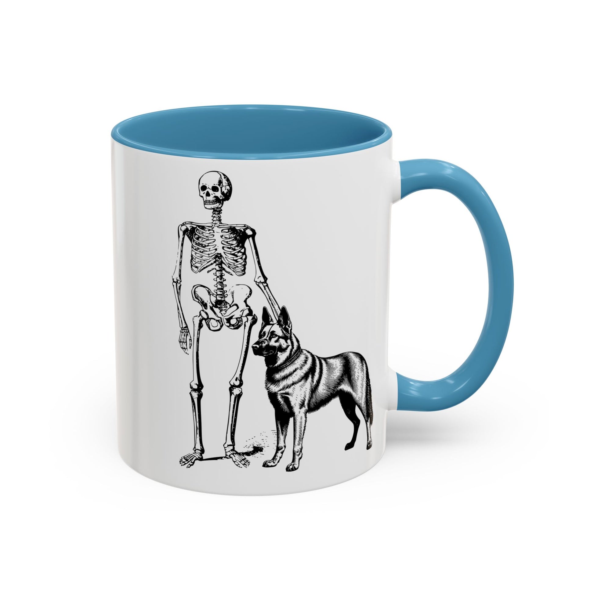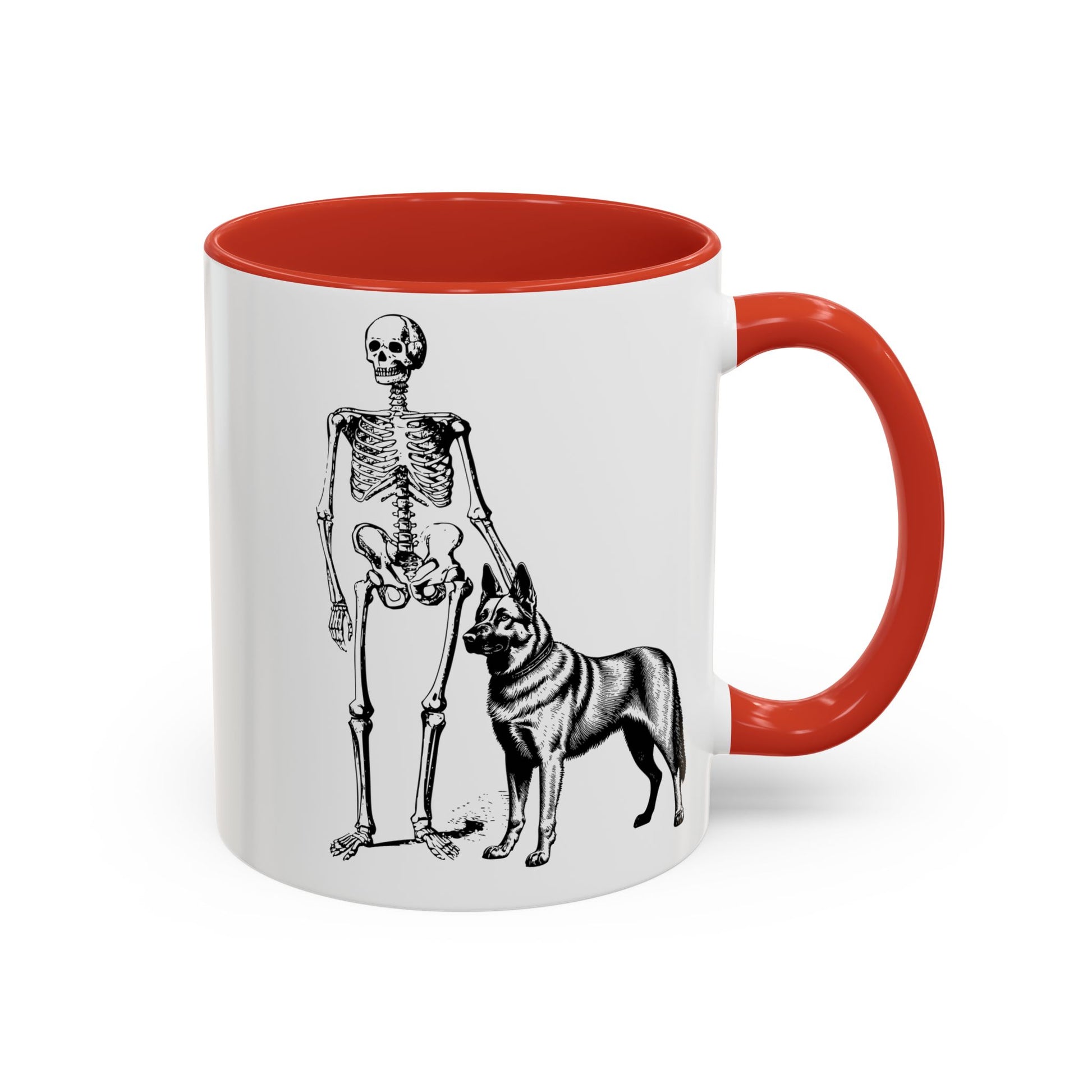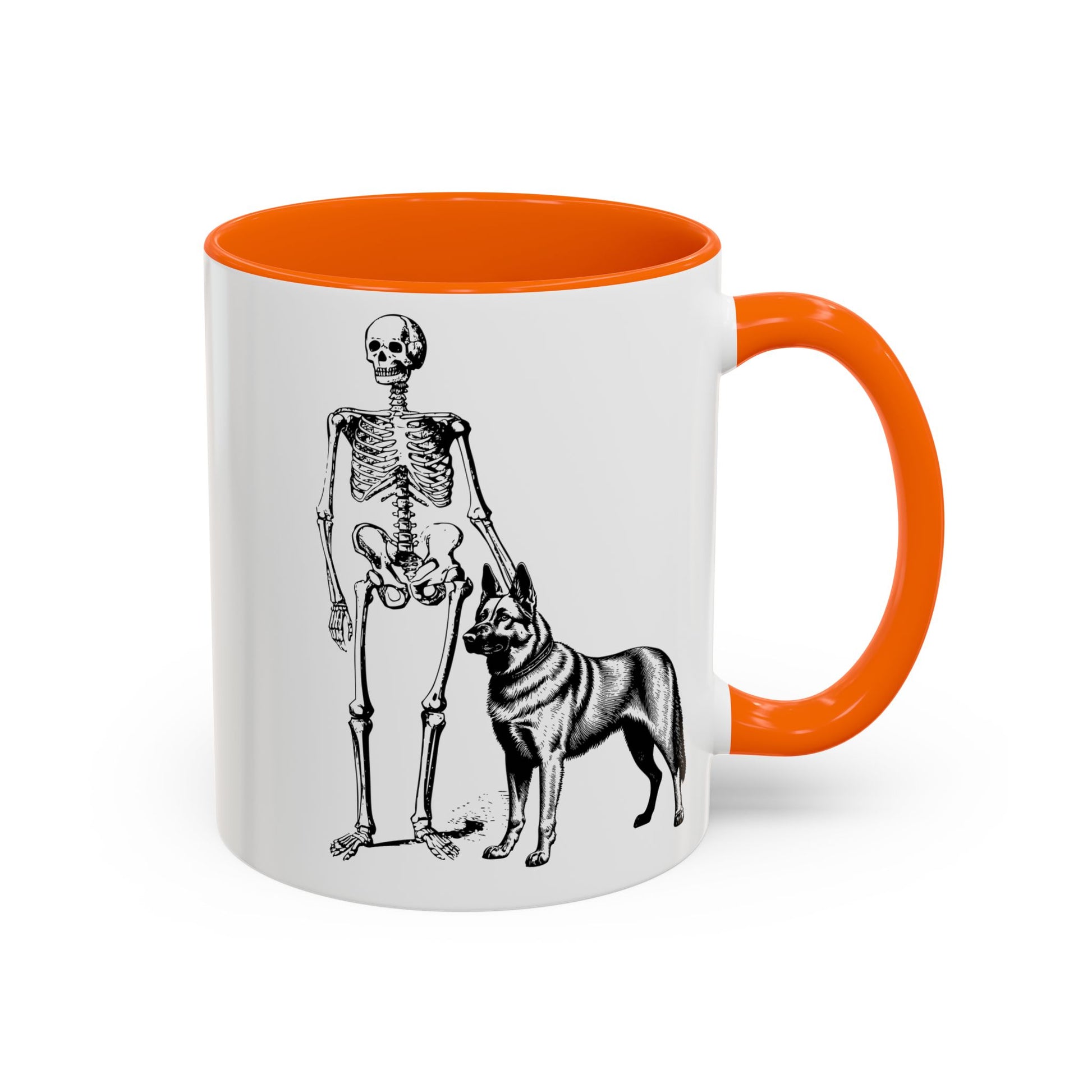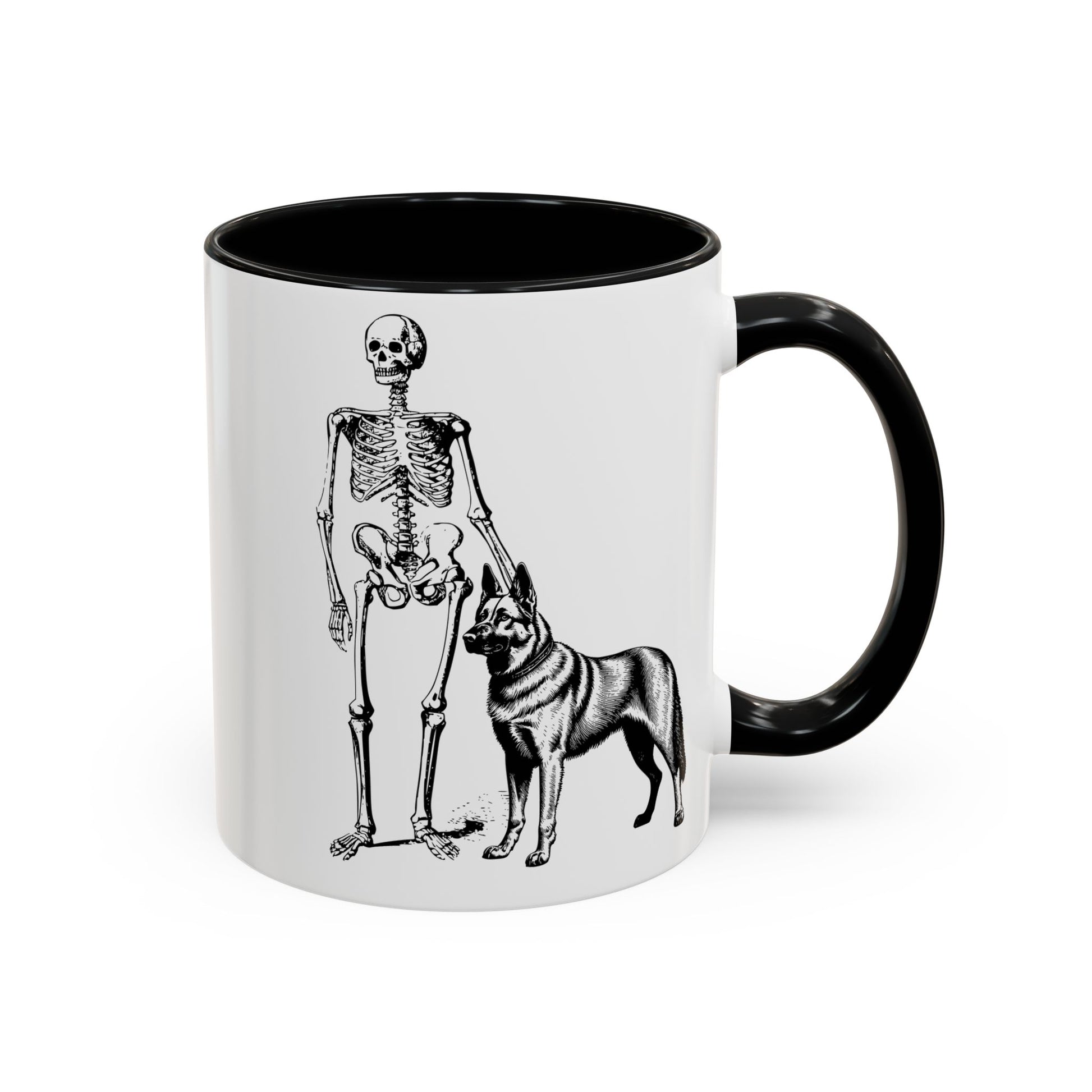 Get into the Halloween spirit with this cool mug featuring a skeleton alongside his loyal German Shepherd pal. This simple yet unique design perfectly blends spooky vibes with a touch of canine loyalty, making it an ideal choice for Halloween festivities.
