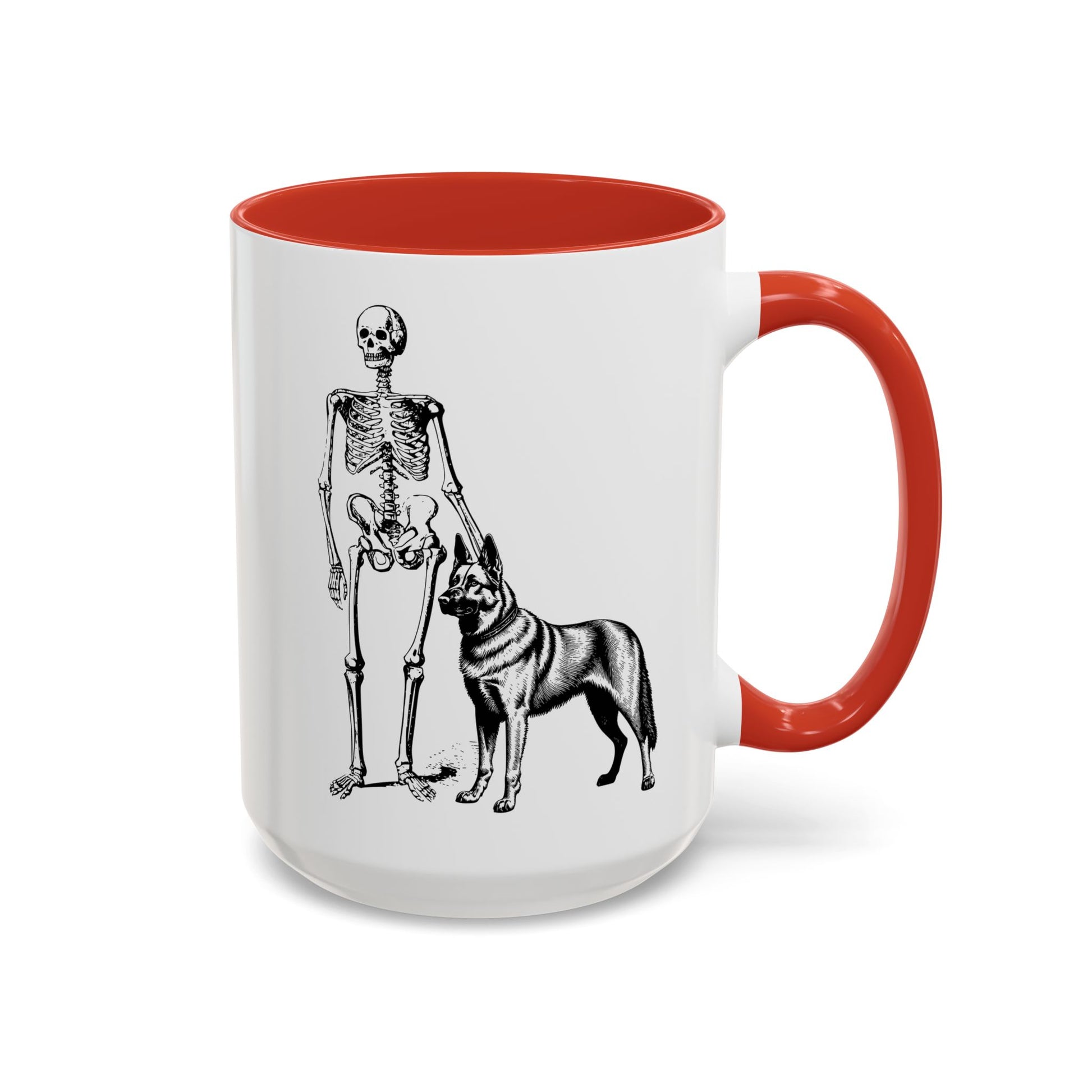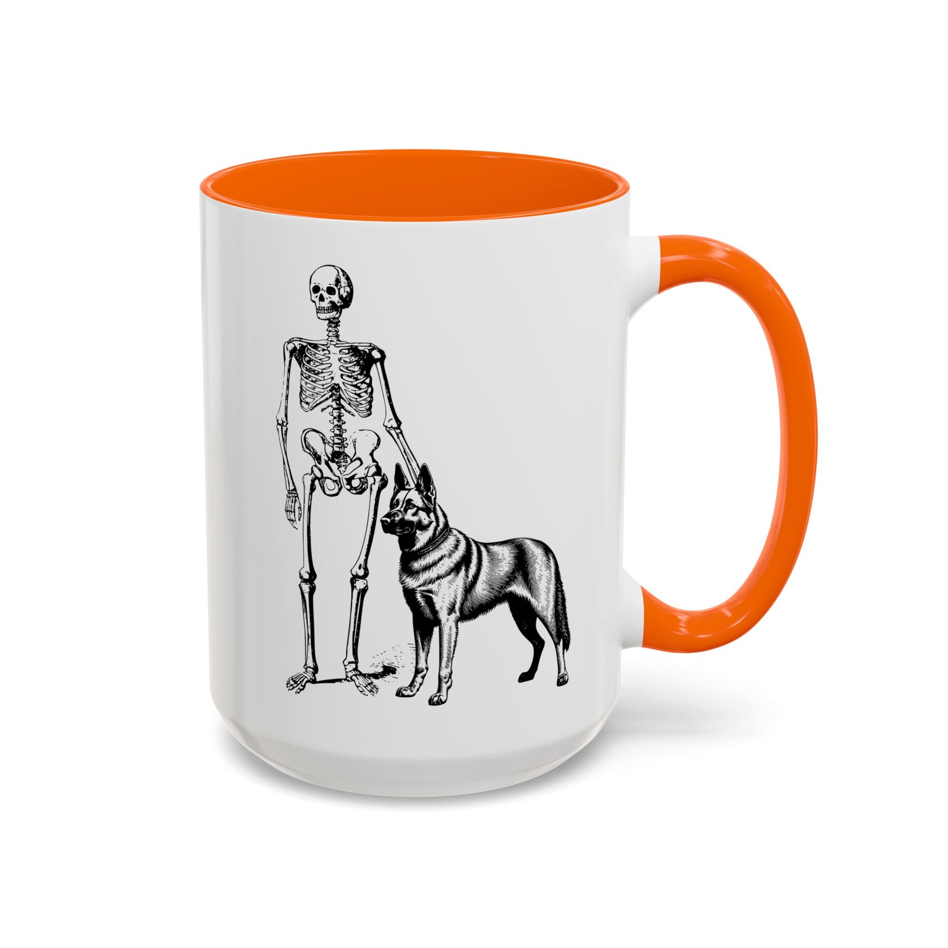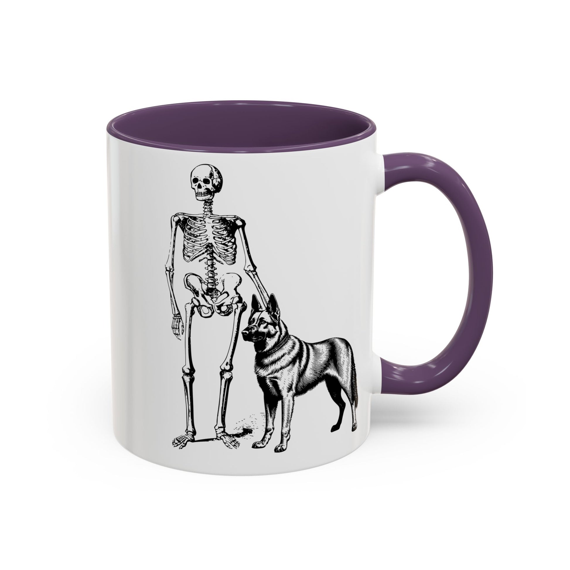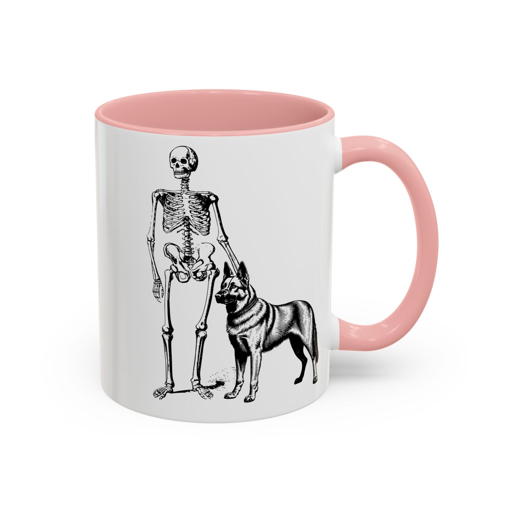 Get into the Halloween spirit with this cool mug featuring a skeleton alongside his loyal German Shepherd pal. This simple yet unique design perfectly blends spooky vibes with a touch of canine loyalty, making it an ideal choice for Halloween festivities.