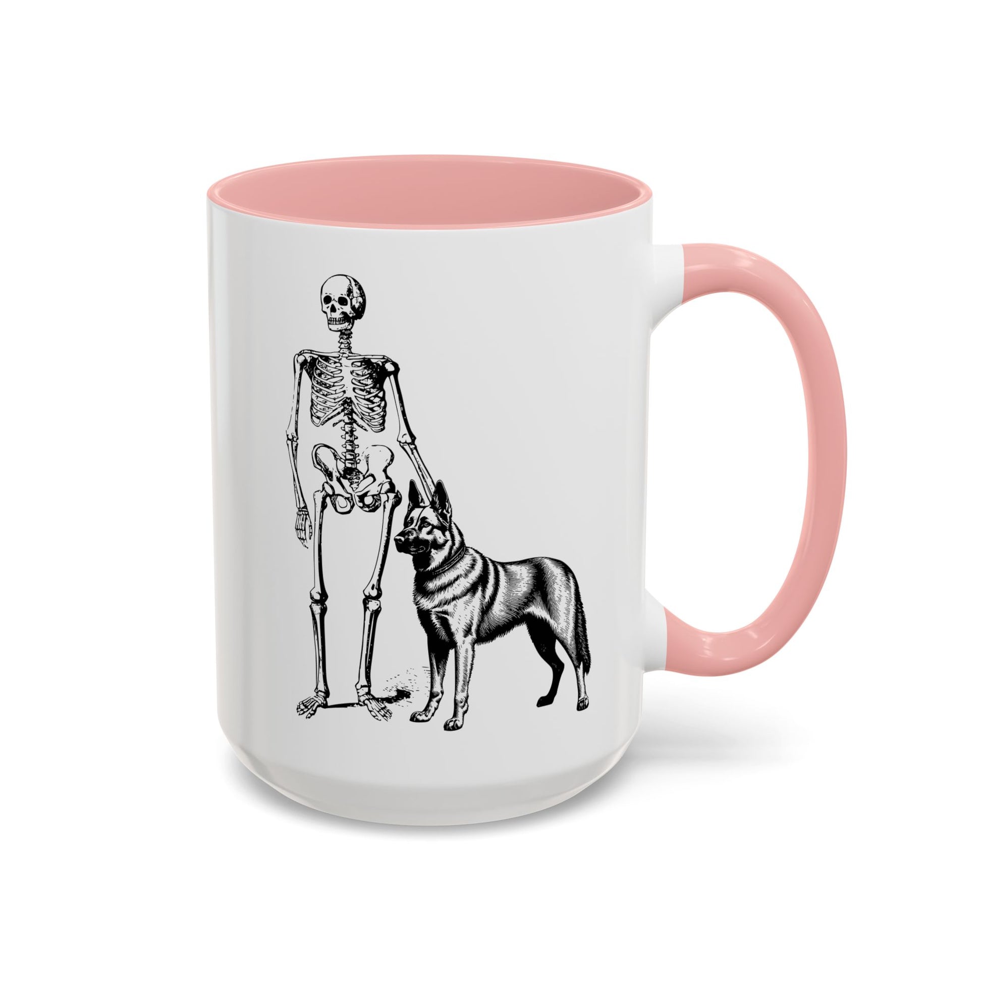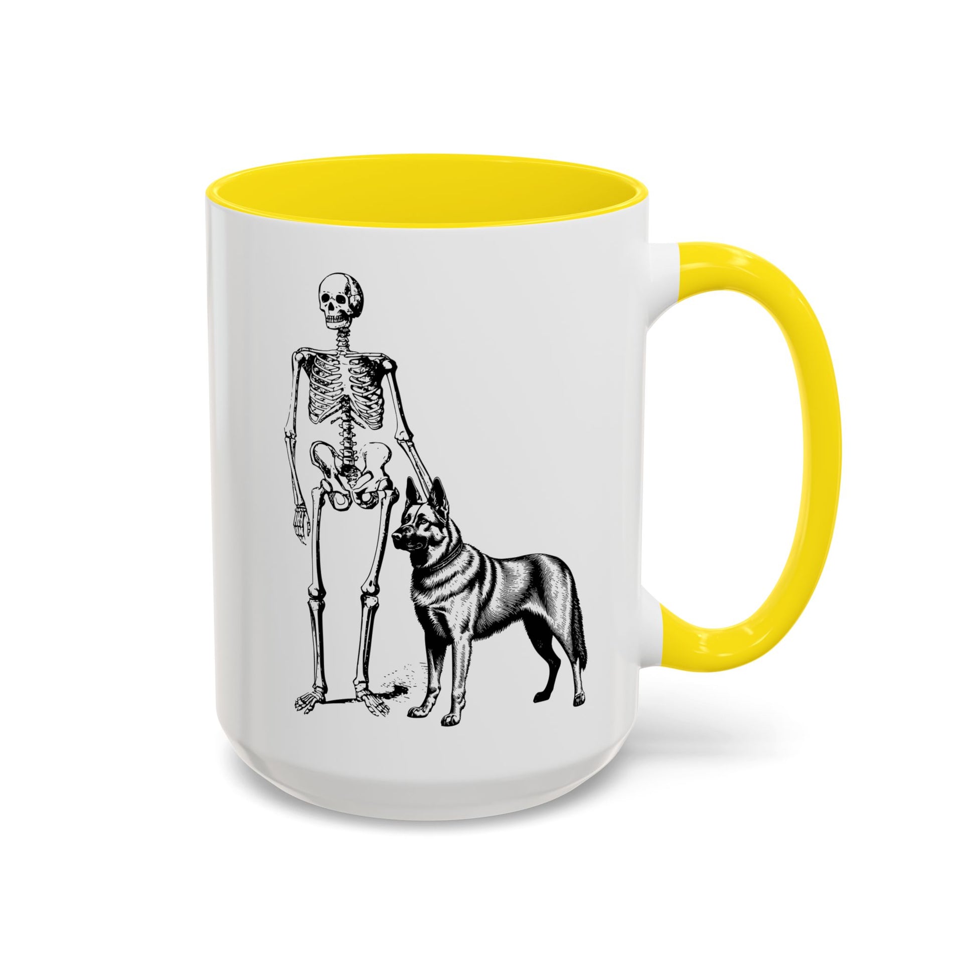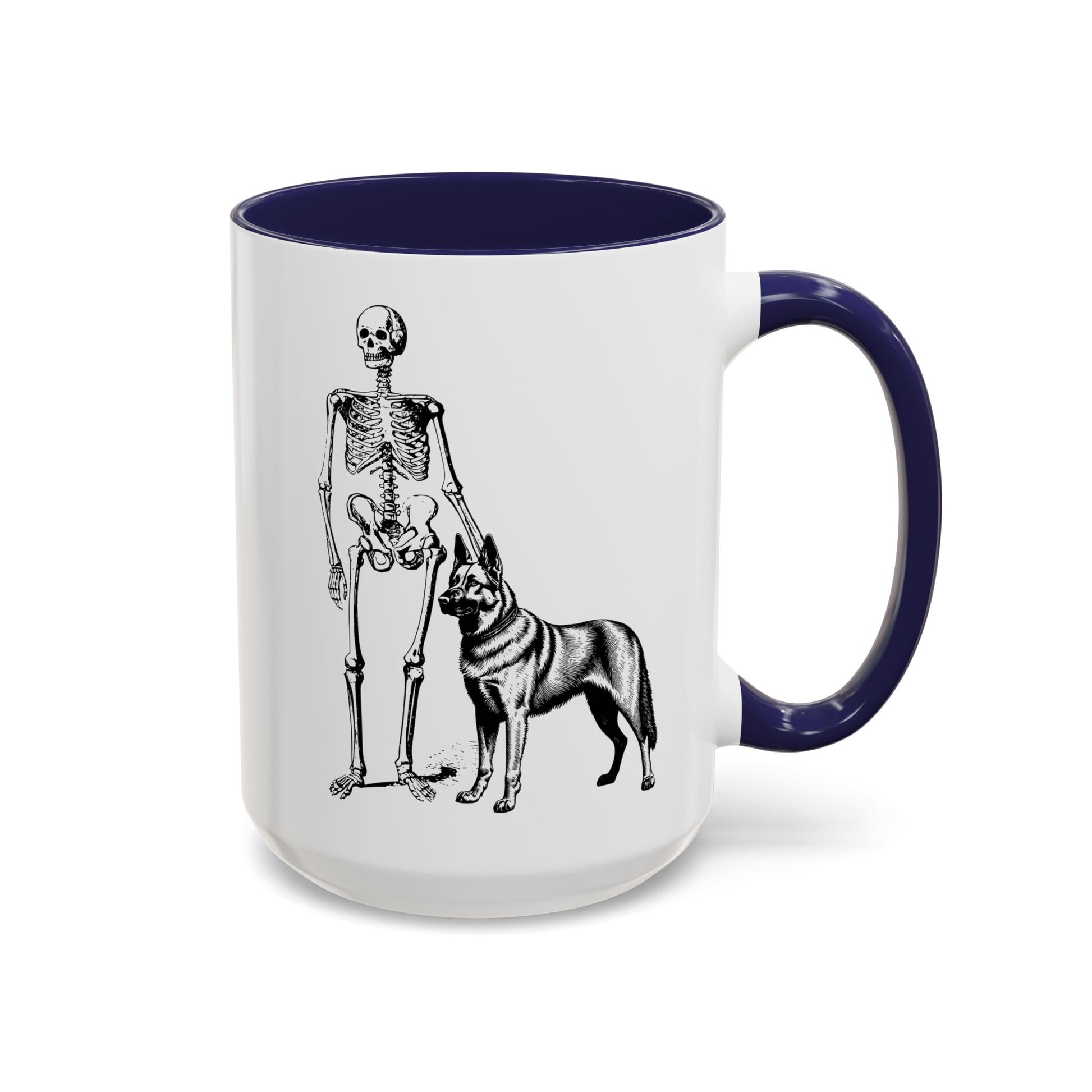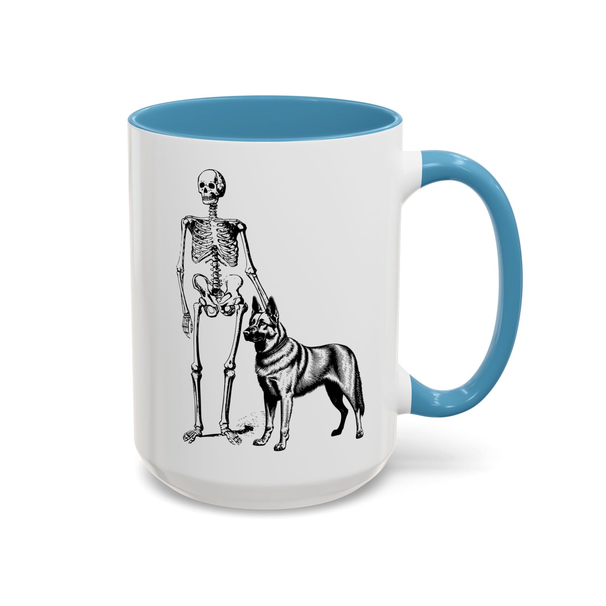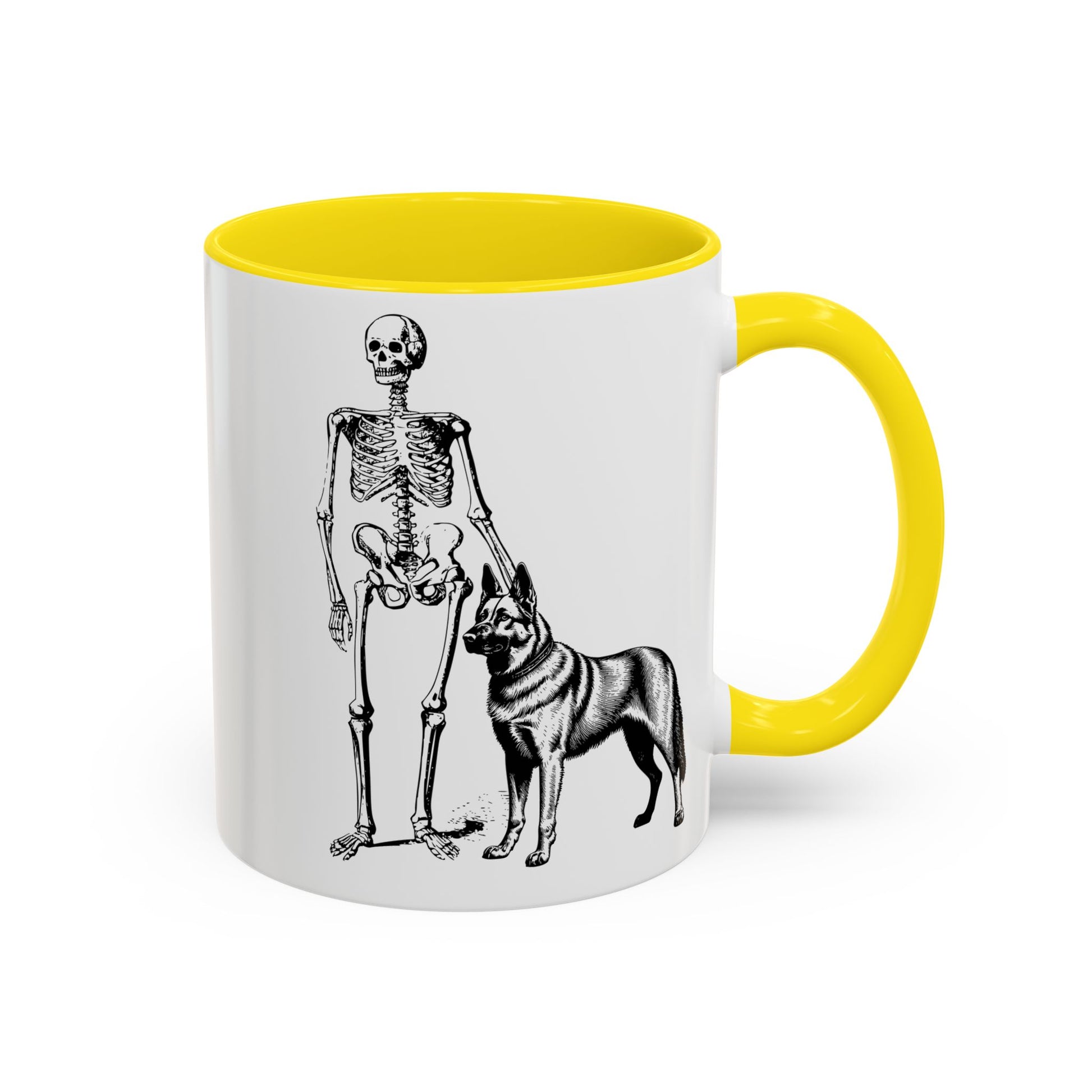 Get into the Halloween spirit with this cool mug featuring a skeleton alongside his loyal German Shepherd pal. This simple yet unique design perfectly blends spooky vibes with a touch of canine loyalty, making it an ideal choice for Halloween festivities.