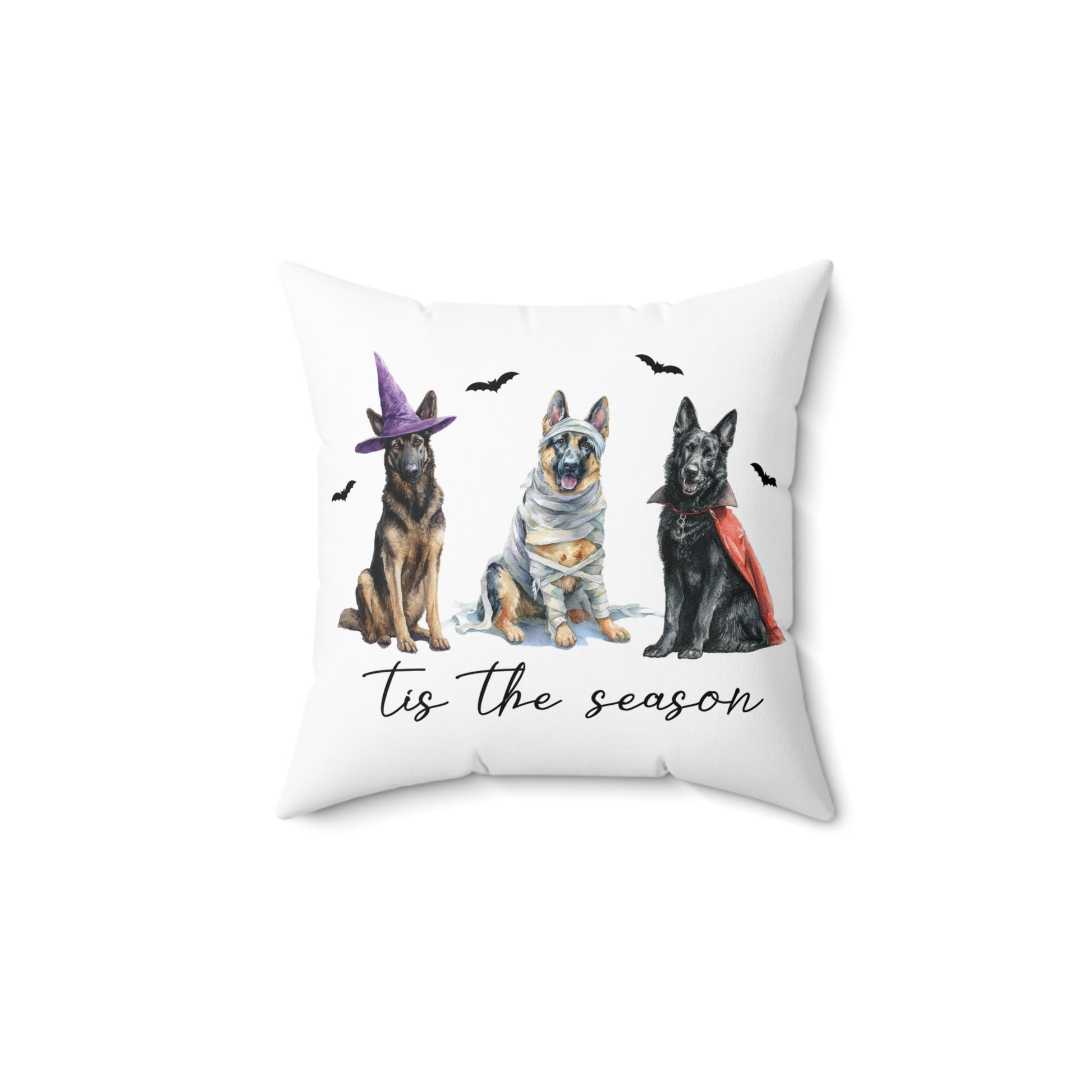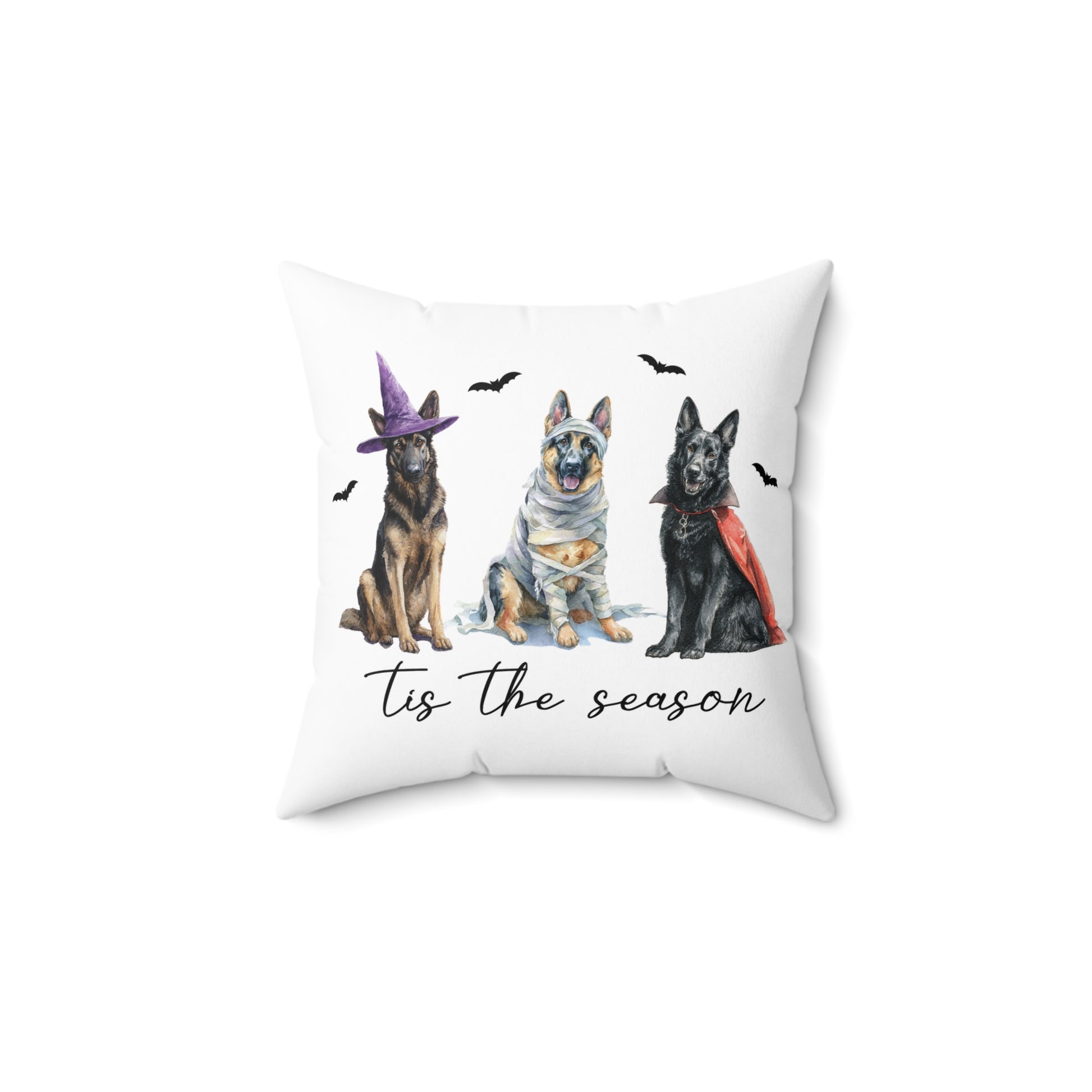 Celebrate spooky season in the cutest way with our “’Tis the Season” German Shepherd design! Featuring three adorable shepherds dressed up for Halloween — a witch, a mummy, and a vampire — surrounded by bats, this design is the perfect blend of festive and fun. Whether you’re trick-or-treating, sipping cider, or just showing off your love for shepherds, this piece brings the Halloween spirit to life.